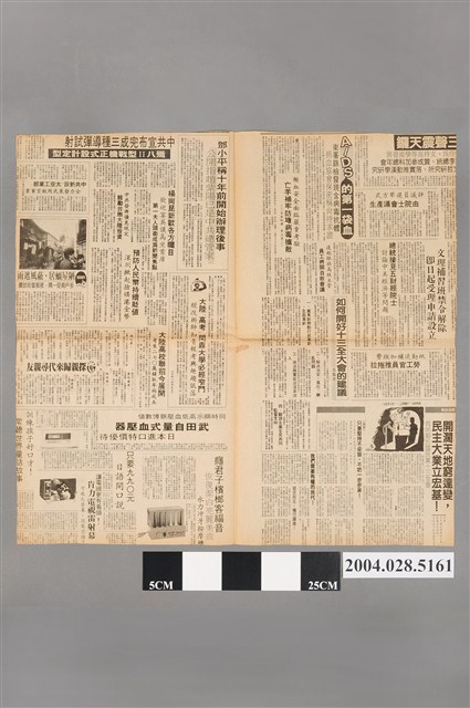 此物件為部分的1988年(民國77年)(1988年)7月7日出版之《自立晚報》,版號因為僅有部份報紙而無法辨識,能辨識的內容計有〈鄧小平稱十年前開始辦理後事 公開稱趙紫陽已是中共總管家〉、〈中共宣布完成三種導彈試射 殲八II型戰機正式設計定型〉、〈楊尚昆新歡各方矚目 歡迎吳儀高坐首席〉、〈中共發佈優惠規定 鼓勵臺胞大陸投資〉、〈預防人民幣持續貶值 深圳掀起搶購金幣〉、〈大陸「高考」問鼎大學閉經窄門 經改掛帥知青報考興趣趨低落〉、〈大陸高校聯招今展開〉、〈探親歸來代尋親友〉、〈評議員選舉方式〉、〈AIDS的第一袋血 衛署篩檢發現含病毒抗體〉、〈文理補習班禁令解除 即日起受理申請設立〉、〈總統接見五財經院士討論中美經濟等問題〉、〈遠航撤換高級主管 員工將開自救會議〉、〈桃勤追補加班費 勞工關員推拖拉〉、〈如何開好十三全大會的建議〉(馬鶴凌)、〈在野黨提出對十三全的期望〉、〈國家隊進軍亞洲女籃 許輝珠將出任教練〉、〈葉瑞森表現再好也沒轍 大馬輸給希臘〉、〈輸球餘怒、激發鬥志 韓國大勝菲律賓〉等等,另有部份廣告。 此物件《自立晚報》於1947年10月10日由顧培根創辦,此報紙曾因政治事件而遭到3次停刊,並且經歷4次大改組、6次搬遷。在1958年政府擬定「九項禁例」、「出版法修改」之後,《自立晚報》發表「無黨無派、獨立經營」的聲明,之後在1959年臺灣重要的社會運動人士吳三連入主《自立晚報》,而在吳三連於1989年去世後,因多有虧損,最終在2001年停刊。 國民黨政府於1945年接收臺灣之始,即派出中央宣傳部整頓臺灣報業,撤廢日治時期管控報紙的許可制度,改為登記申請制。因而雖然日文欄之廢除導致銷量縮減,但管制解除使得戰後初期的「辦報」大增。但是國民黨政府在二二八事件之後,發布戒嚴並且嚴格管控報紙發行,屢以「節約資源」、「端正文化」等理由施行「報禁」。在1958年,政府通過〈第五次出版法修正案〉,掌控臺灣報業。對此當時的香港《星島日報》在社論上指出:「自撤出大陸以來,昨日(修正案通過日)為自由中國最悲慘的一日,是最使人失望的一日!吾人為自由中國亡之命運危,為自由中國之前途哀,天乎!禍降我國,何以至此之極也!」 。(王天濱,2002。154-170)