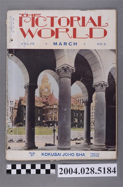 此為一紙質雜誌。此書為東京國際情報社於1937年(昭和12年)3月1日出版的《世界畫報》第13卷第3號。 《世界畫報》創立於1923年,編輯發行單位為東京國際情報社。 此物件為日本戰爭時期發行的雜誌,內容多與戰爭報導多有相關。日本在戰爭時期,對於民眾的政治宣傳以任何形式出現在民眾視野中,從暑假作業簿、主婦雜誌、交通通勤的廣告、宣傳單、唱片、學生制服都有對於戰爭的相關宣傳。此現象起源於日本在1931年的滿州事件爆發後,日本的國內的右派人士、軍方發表一連串「日本主義」相關的言論,將日本的民族主義以及愛國主義傾洩出來,並且在「天皇機關說」事件後將天皇的領袖地位大幅提升。因而在「日本主義」以及神武天皇的「八紘一字」的理想下,將日本對外戰爭正當化、神聖化。