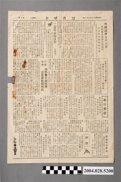 本物件為《洋裁時報》第三十三期,民國46年3月19日出刊。第一版上列有報社相關登記資料(創刊為民國45年1月31日 )及廣告二則:「柑桔菓樹苗圃中美農園劉火土新埔鎮中正路三七三」、「臺灣工礦股份有限公司董事長許金德(五大部門)紡織部 銅鐵機械部 煤部 營建部 化工部」;頭版報導主題有「如何選出我們理想的省議員和縣市長」、「鄒滌之先生之世系與家庭簡介」;第二版報導主題有「竹縣議會七次大會」、「鄒滌之先生感召了前方戰士 選舉史上平添了一篇佳話」、「二百年前的泳裝」、「攤販怨聲 地點優良價格賤 深巷攤位價格高」,以及報導新竹本地雜聞「新竹雜綴」:「選舉當選乃無慮 目的在係爭多票」、「林炳章 忙人忙上又加忙 認為忙碌是幸福」、「省議員選舉出解老(解慶)目的只是等遞補」、「鄭家兄弟(鄭肇基二子)鬧糾紛 首長權作魯仲連」、「究是課長勝警員 還是警員勝課長」、以及戲院「檢票女郎欠禮貌 未尊重軍公人員」,並有「影壇消息「基隆七號房慘案女主角洪明麗小姐」、「美空雲雀東山再起 她不敢再靠近觀眾了」,背頁右下有「洋裁時報啟事」,社長吳馥如說明該社已於三月改組,月底前職員須報到並登記名冊核派工作,俟聘書服務證證章製妥後再行核發,如有持社長所聘職員之服務證等證件視為無效。