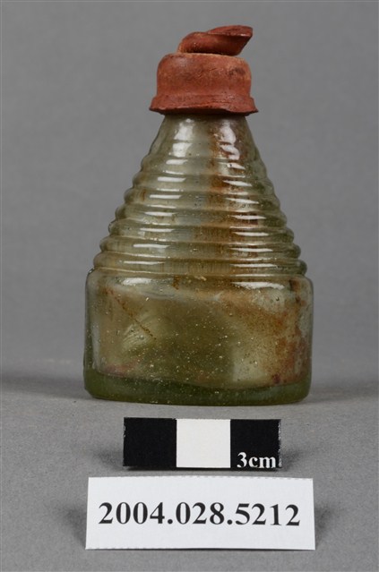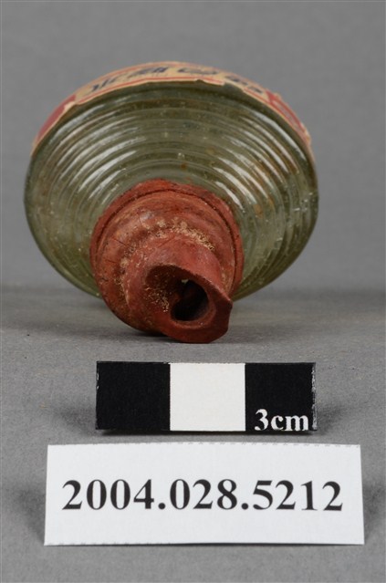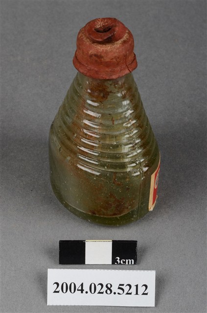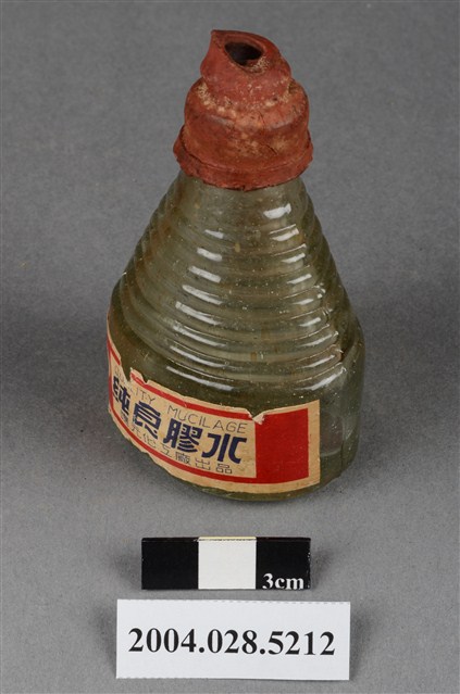 本文物為膠水空瓶,瓶身為三角圓椎型玻璃材質,瓶蓋材質為橡膠已呈氧化現象,瓶身有「QUALITY MUCILAGE/純良膠水/應元化工廠出品」三行文字標籤。