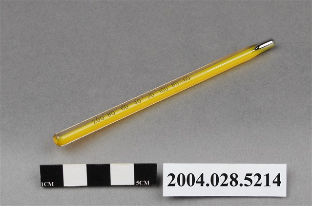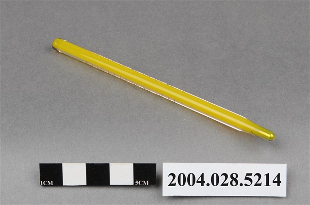 1.本件水銀玻璃體溫計,玻璃管身呈三稜柱形,體溫計末端的盛裝水銀的玻璃球則為短圓柱形,玻璃管內徑非常細小,內徑連接水銀球管頸處又更加狹窄,以防止體溫計使用後水銀柱自動下降,在三稜柱2個短面交界處印有刻度,玻璃三稜柱較寬的底面染成黃色,以利於讀取溫度,刻度由60起標到200,每4格刻度標示數字便增加20,刻度兩端分別註明「C」及「1/5」,表示此溫度計每一格刻度為0.2度攝氏溫度。2.水銀體溫計,由玻璃製成包含水銀球及水銀柱的溫度計,利用水銀熱脹冷縮的原理來測量溫度。末端水銀球會隨測量部位不同有不同形狀和大小,例如量口溫或腋溫的水銀球呈細長型、量肛溫的水銀球則較短而圓。因價格便宜、體積小巧,使用方便且示溫準確,1867年英國醫生Thomas Allbutt發明僅3英吋長,醫用體溫計,因小巧且讀取方便,被醫界廣泛使用,為現代水銀體溫計的原型,,惟水銀是有毒物質,對人體及環境有危害,已被淘汰不再使用,臺灣於2008年禁用。