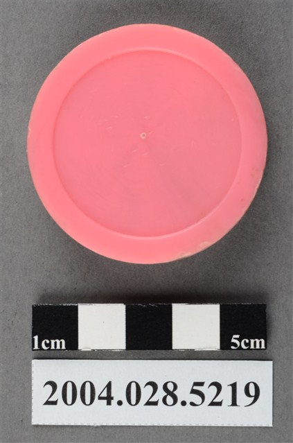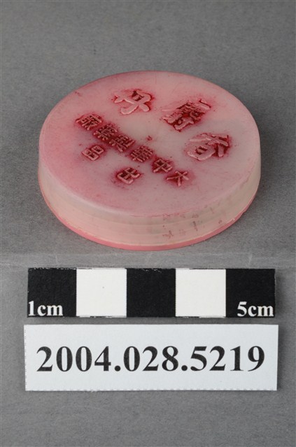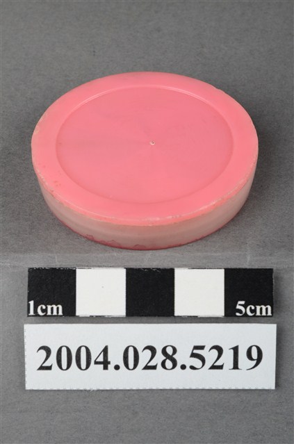 本物件為香麝丹之藥盒。藥盒為圓形,粉紅色,似塑膠材質。盒蓋上有凸起文字,分別是香麝丹和大中華製藥廠出品。