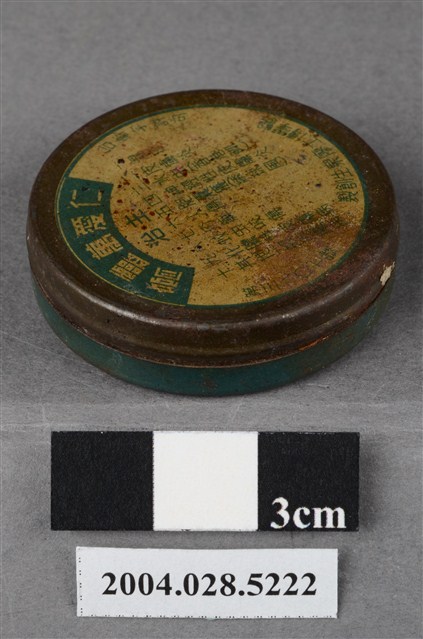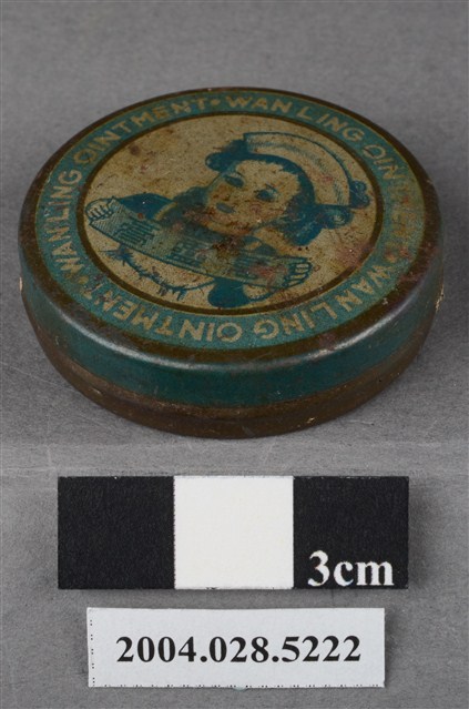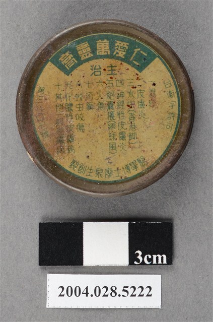 1. 本物件為仁愛萬靈膏之藥盒。藥盒為圓型鐵製品。盒蓋上最外圈印有一圈WANLING OINTMENT字樣,中間是一兒童樣護士手持一個牌子上寫萬靈膏字樣。盒底印有仁愛萬靈膏、臺衛字許可第3807號、醫學博士廖泉生創製字樣和主治效能內容(濕疹、皮膚炎等)。