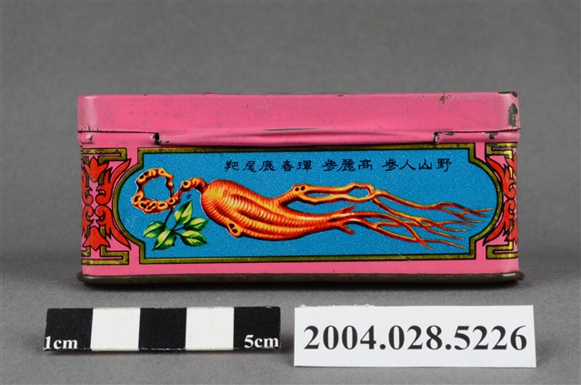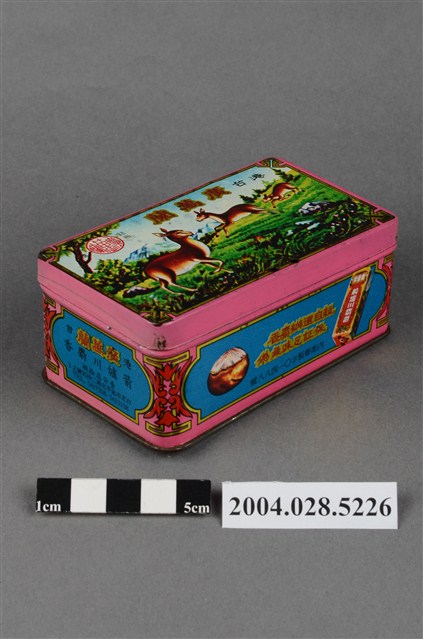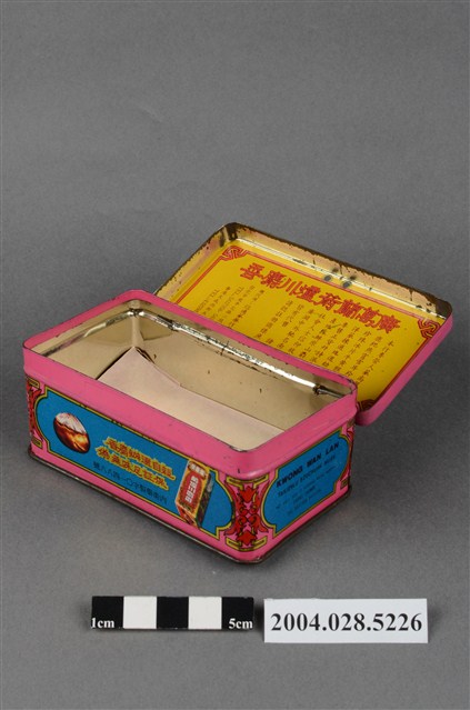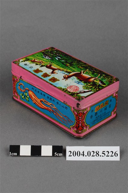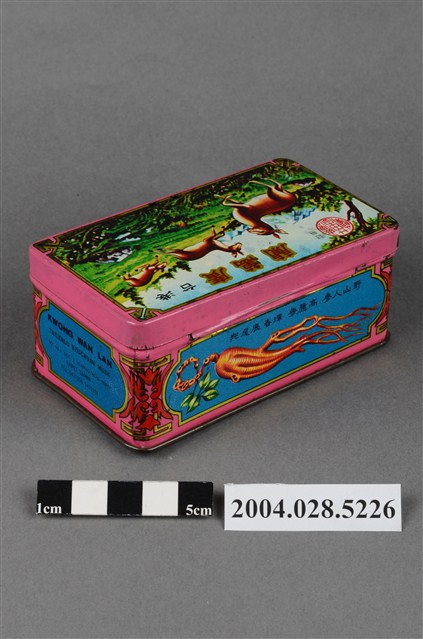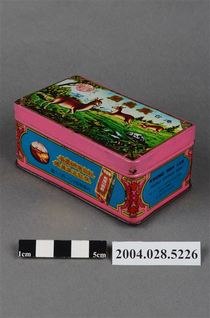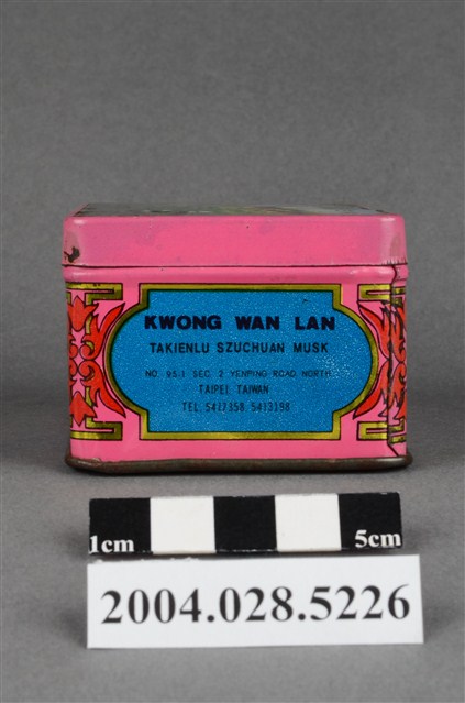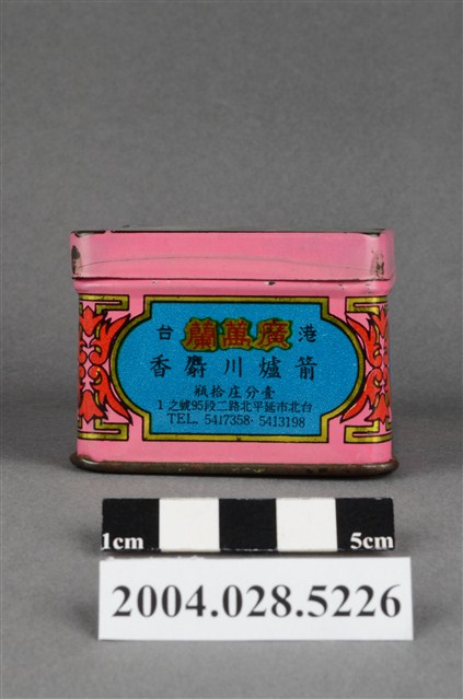 本物件為廣萬蘭箭爐川麝香之藥盒。藥盒為鐵製品,底色為粉紅色。盒蓋上的圖片為一片原野,有3隻鹿在活動,印有港台廣萬蘭字樣和廣萬蘭註冊商標。盒底為顧客注意內容。盒身寬側面一面印有箭爐川麝香之紙盒包裝圖案和內衛藥製字01488號、親自選辦麝香、保證足味無偽字樣。另一寬側面則印有人參圖片和野山人參、高麗參、琿春和鹿尾羓等字樣。窄側面一面為藥廠英文資訊,另一面為中文資訊,有港台廣萬蘭箭爐川麝香、壹分庄拾瓶等字樣和藥廠資訊。盒蓋內側有藥品說明和代理商資訊,代理商為信通蔘藥行有限公司。