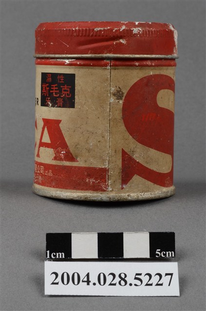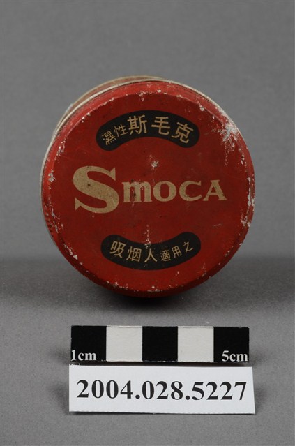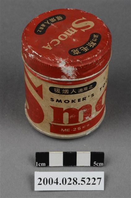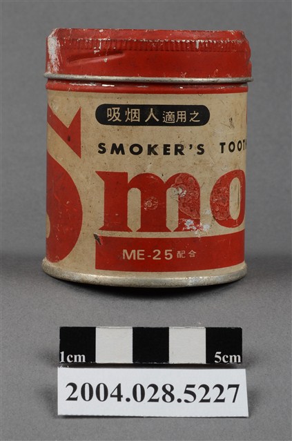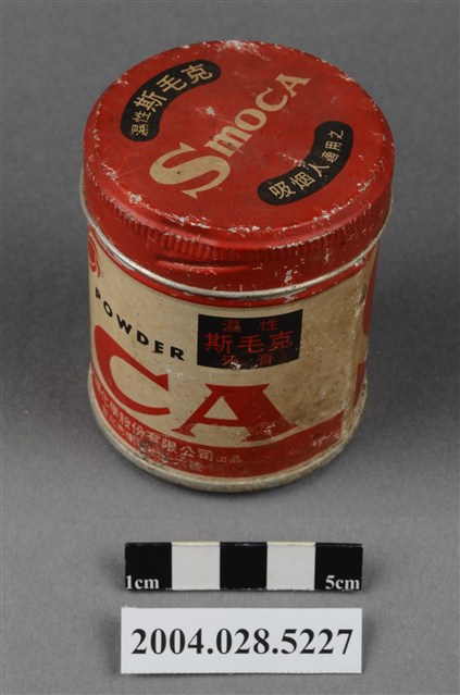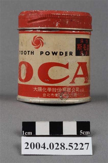 本件大陽化學股份有限公司製斯毛克濕性牙膏,應仿製日本傳統牙粉品牌SMOCA。牙膏可分為罐蓋與罐身2部件,外觀呈圓筒狀鋁罐,於表面作紅、白與黑色3色印刷。罐蓋表面以紅色為底,頂面中央橫書白字「SMOCA」,上下邊各以曲面長橢圓形黑底框內印「濕性斯毛克」與「吸烟人適用之」,側身內層帶有螺旋紋,可與罐身作旋轉開闔。罐身以白色為底作橫式長方形版面設計,「SMOCA」紅色字樣為大標題布滿版面中段處,上方印有「TOOTH POWDER」,頂端為紅色漩紋太陽商標。右側以長方形黑色框,內作紅字「濕性斯毛克牙膏」商品名稱,左側為長橢圓形黑底框,內作白字「吸烟人適用之」。標題下段則以紅色帶狀為框,內有「ME-25配合」、「大陽化學股份有限公司出品」、「台北市衡陽街十六號」。
