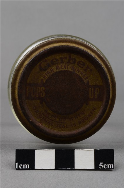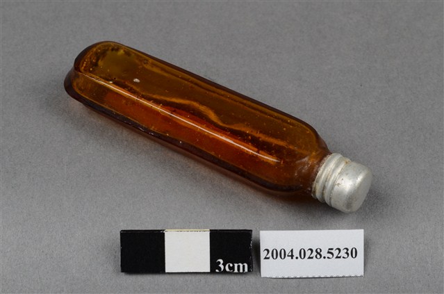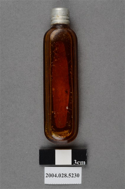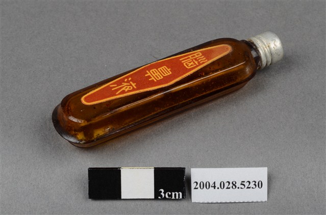 本物件為腦鼻液。長條型瓶身為透明深茶色,瓶身上貼有一紅色標籤紙,上有黃色字樣「腦鼻液」。瓶蓋為銀色,似金屬材質。另有一玻璃瓶,有一金屬蓋,金屬蓋上有英文字,分別為Gerber、HIGH MEAT DINNER、POPS UP、POPS UP WHEN ORIGINAL SEAL IS BROKEN。