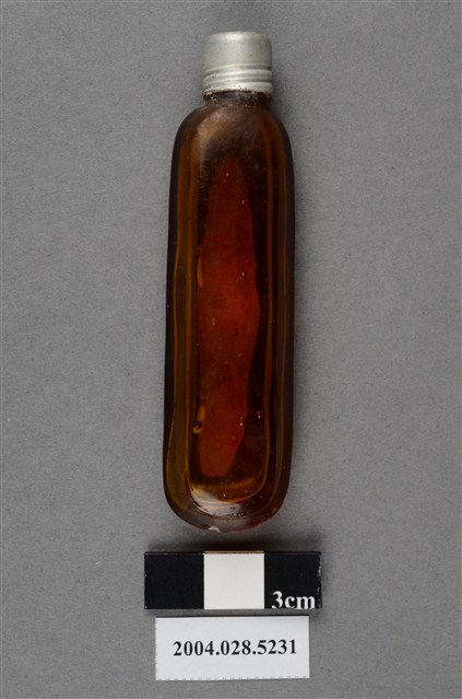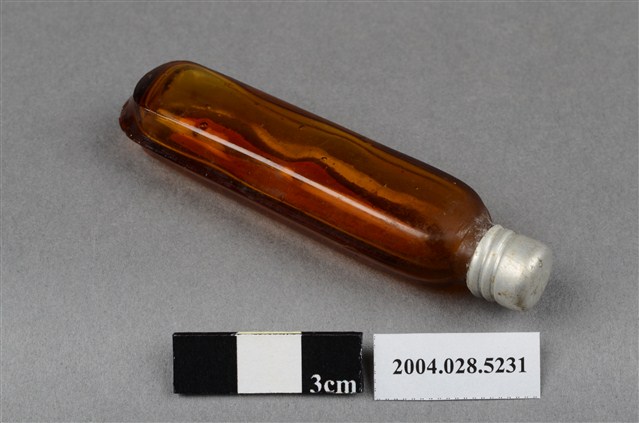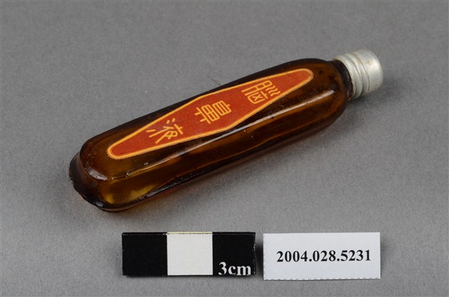 本物件為腦鼻液。長條型瓶身為透明深茶色,瓶身上貼有一紅色標籤紙,上有黃色字樣「腦鼻液」。瓶蓋為銀色,似金屬材質。另有一玻璃瓶,有一金屬蓋,金屬蓋上有英文字,分別為Gerber、HIGH MEAT DINNER、POPS UP、POPS UP WHEN ORIGINAL SEAL IS BROKEN。