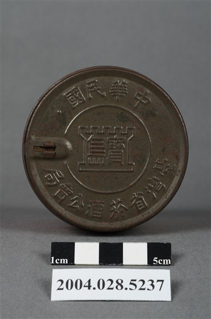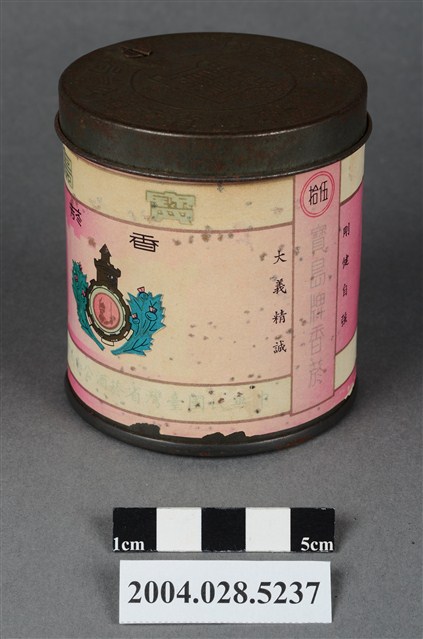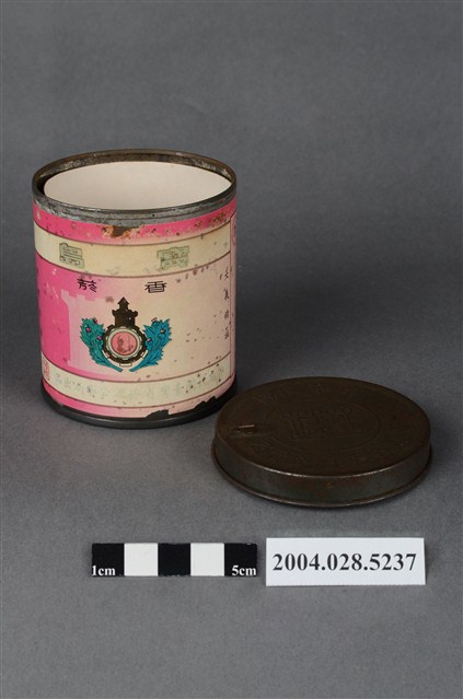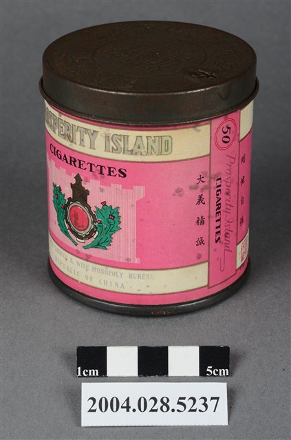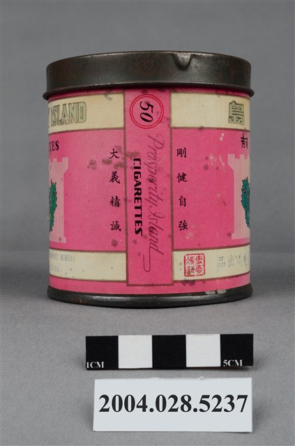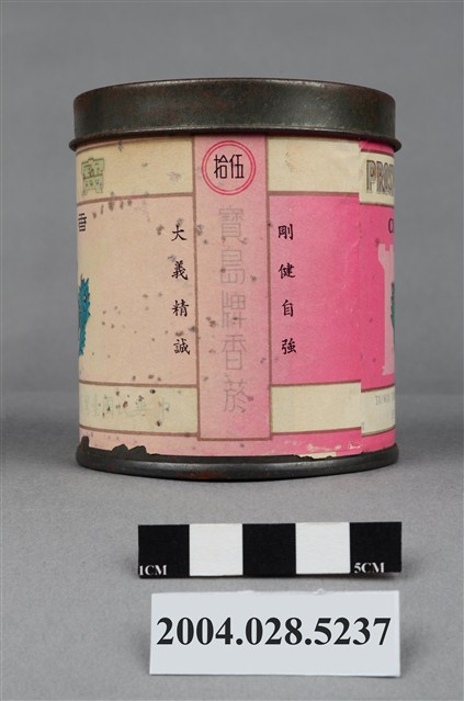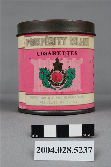 1.本物件為臺灣省菸酒公賣局出品寶島香煙罐,材質為鐵,為圓筒罐裝,其以包裝紙條包裹菸罐,紙條上方部分為白底,有「寶島」、「PROSPERITY ISLAND」灰色字樣,紙條中段部分底為粉紅色,有堡壘式圖案,中有騎士舉劍圖像,並有「香菸」、「大義精誠」、「剛健自強」、「CIGARETTES」黑色字樣,其兩側則分別有「伍拾」、「寶島牌香菸」與「50」、「Prosperity Island CIGARETTES」黑色字樣,紙條下方部分底為白色,有「中華民國臺灣省菸酒公賣局出品」、「TAIWAN TOBACCO & WINE MONPOLY BUREAU TAINAN BRANCH」、「REPUBLIC OF CHINA」灰色字樣;香菸罐之蓋子有「寶島」、「.中華民國.」、「臺灣省菸酒公賣局」凸版字樣;底部無圖案與字樣;罐中並無內容物。