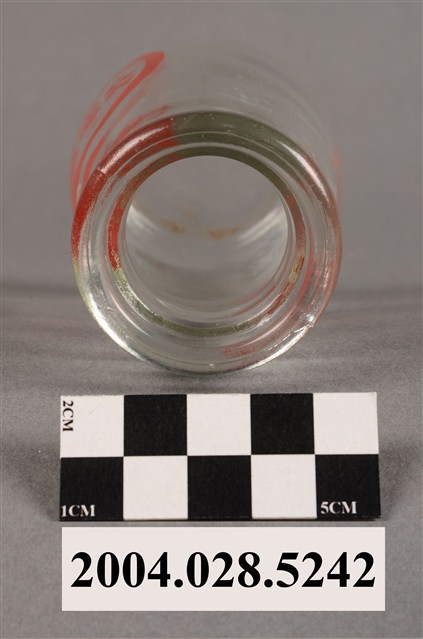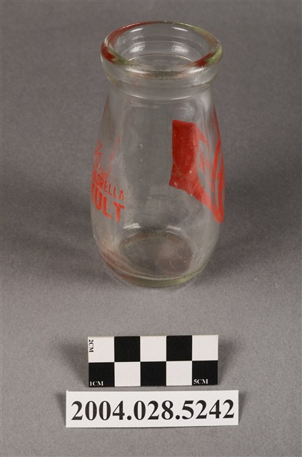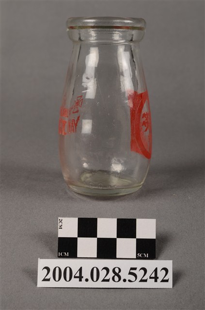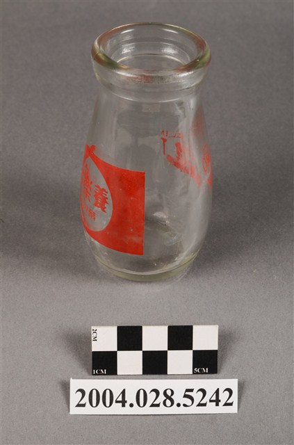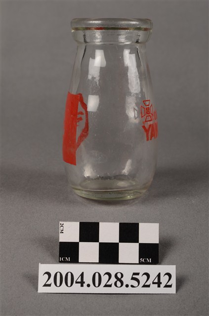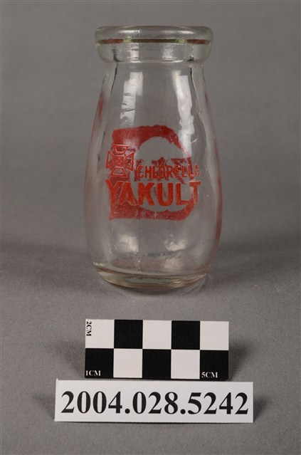 1.此件玻璃養樂多瓶由透明玻璃製成,長約5.4公分,寬約5.4公分,高約9.6公分。瓶口寬廣,溜肩並以微微曲線至瓶底。瓶身正面印有紅色標誌與文字,標誌為圓形框內印著「養樂多」、「酵母乳」兩行字。瓶身背面印有「CHLORELLA」、「YAKULT」兩行字,左上角印有四個口與田字組成的“代田標記”公司標誌。2.臺灣在早期民生用器具多由陶、瓷製成,玻璃製品屬珍稀進口物品,多為上層社會人士所用。直到日治時期受總督府西化、現代化的影響下,引進與開發玻璃產業,玻璃製的日常用品才漸普及於社會大眾。而養樂多的起源為日本