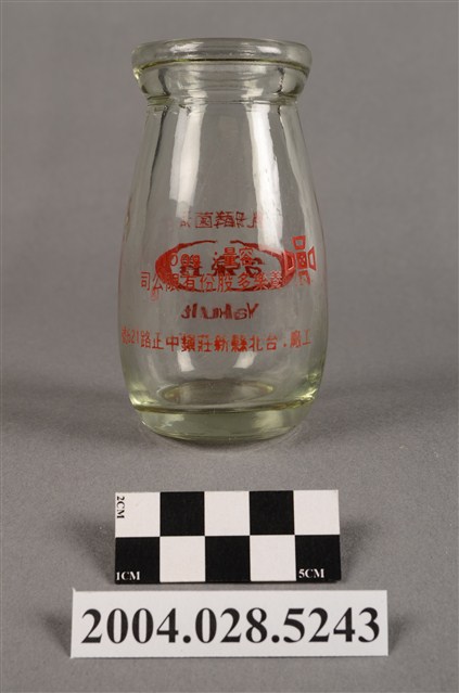 1.此件玻璃養樂多瓶由透明玻璃製成,長約5.4公分,寬約5.4公分,高約9.6公分。瓶口寬廣,溜肩並以微微曲線至瓶底。瓶身正面印有紅色標誌與文字,標誌為橢圓形框內印著「養樂多」,上方印著「活菌酵母乳」,下方印著「Yakult」,右下角有著圈內R字的註冊符號。瓶身背面印有「容量:100g」、「養樂多股份有限公司」、「工廠:台北縣新莊鎮中正路621號」字樣,右上角印有四個口與田字組成的“代田標記”公司標誌。2.臺灣在早期民生用器具多由陶、瓷製成,直到日治時期受總督府西化、現代化的影響下,引進與開發玻璃產業,