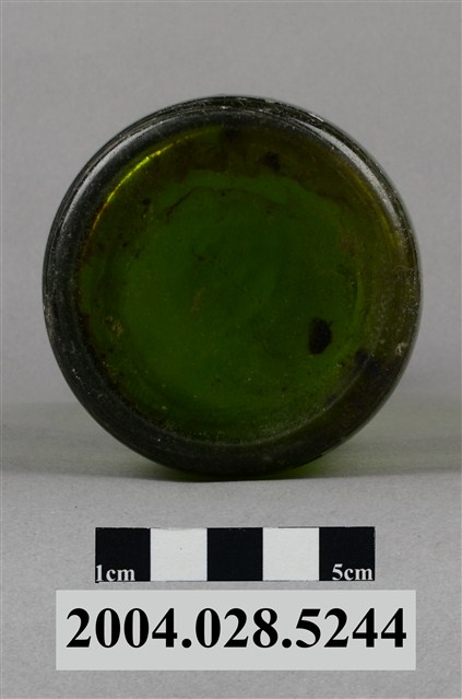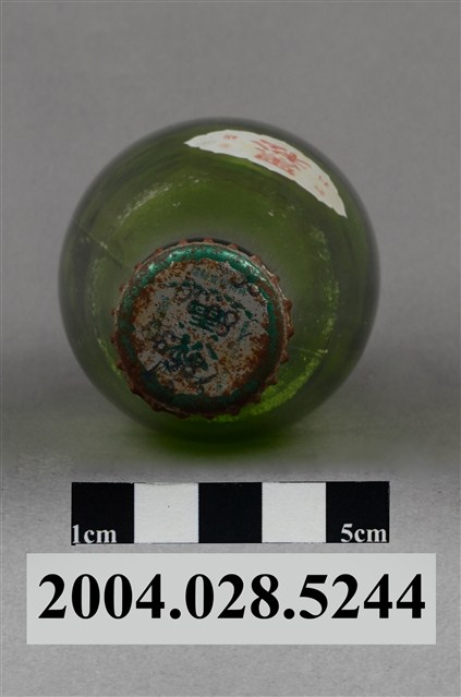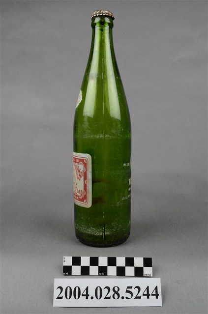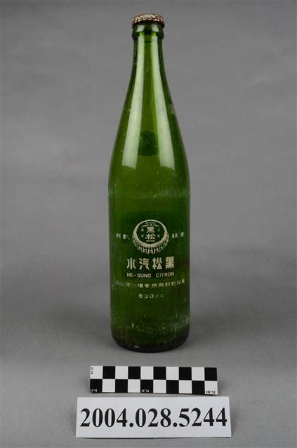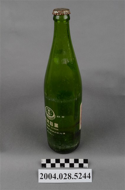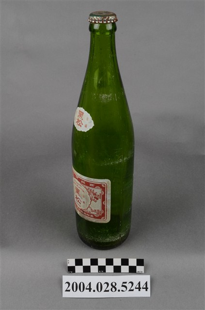 1.此件玻璃汽水瓶由金屬蓋與深綠色玻璃組成,長約7.5公分,寬約7.6公分,高約29公分。瓶蓋為皇冠式瓶蓋,上面印有黑松的標誌,但因鏽蝕而模糊不清。連接至瓶口有一圈突起,瓶頸溜肩,至瓶身後直筒到瓶底,瓶身有磨損痕跡。瓶頸正面印著八菱鏡形狀的白底紅字「黑松」與「高級飲料」字樣。瓶身印著黑松飲料股份有限公司的標誌,標誌為白色與紅色組成,構圖繁複,背景為松樹生長之姿,上下方各有著「高級飲品」、「黑松飲料股份有限公司」字樣,前方為八菱鏡內印著「HE-SUNG」、「黑松」、「註冊商標」、「CITRON」字樣。瓶身背