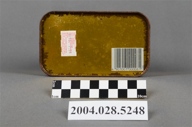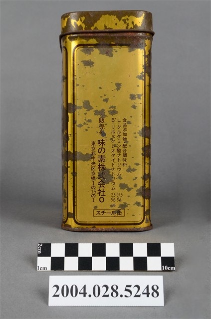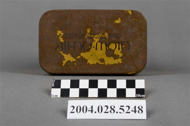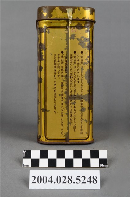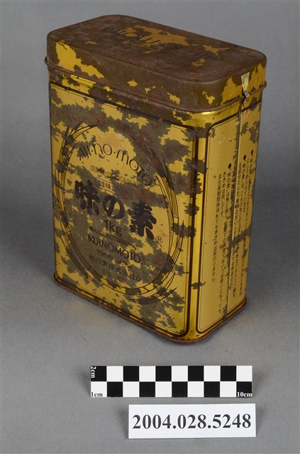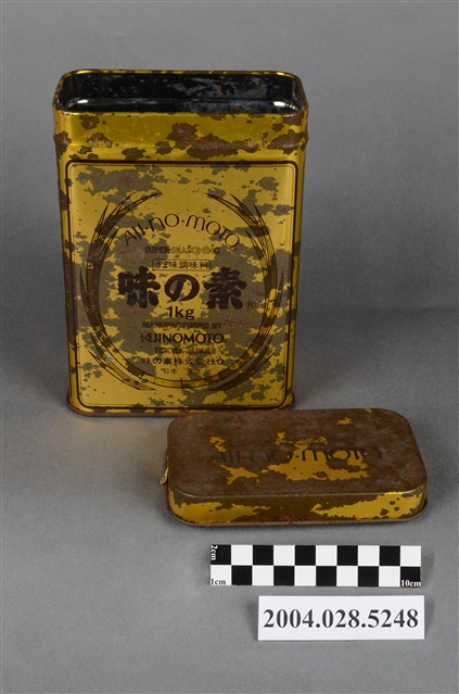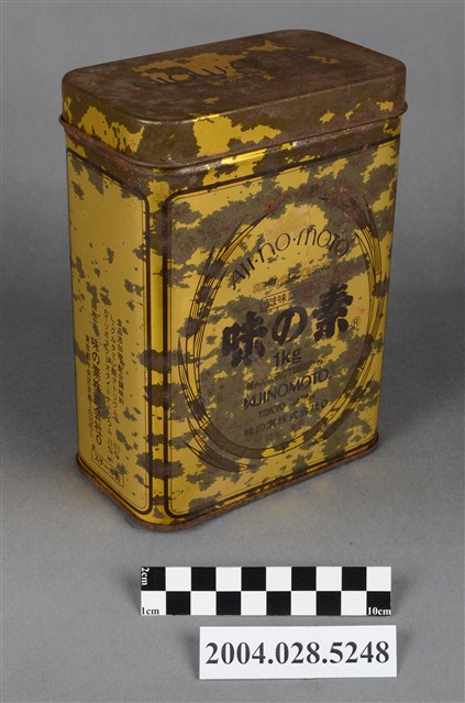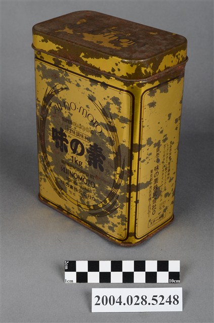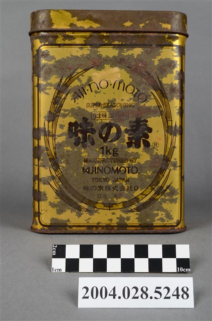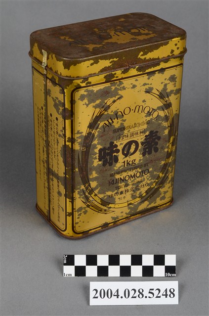 1.本件味之素株式會社製味之素鐵罐呈長13公分,寬7.8公分,高17.5公分之直式扁身長方體,又可分為罐蓋與罐身2部件。鐵罐表面通身呈現金黃色,主要以深咖啡色印刷日文,現已略帶斑駁與鏽蝕,正面與背面皆作相同設計,兩側印刷相同產品特色與注意事項文字。正面以附有竹葉片之竹節左右包圍成圓環形,上堆印有「AJI•no•moto」羅馬拼音,中央處為「味の素」,下端標示為1公斤包裝,以及「味の素株式會社」與英文翻譯。本件鐵罐底部令貼有標籤,為日本進口臺灣之輸入品,另打印有製造日期「1993.2.24」。2.味素又稱味精,學名為麩胺酸鈉,於1908年由池田菊苗從海帶提煉出來的新型調味品。1909年開始商業生產販賣,味之素即為專利生產的品牌。本件藏品之製造商為味之素本舖株式會社鈴木商店,對照其公司沿革歷史,可推測為1932年之後出產的商品。味素於食物烹煮時,添加少量於其中,可增添鮮味,提升食物的美味程度。