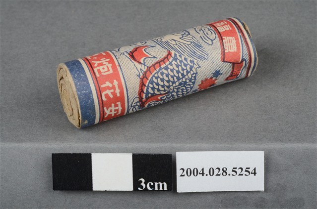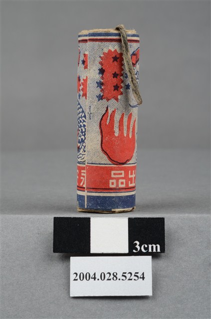 1. 本件為永安花炮工廠出品之萬福炮,炮身呈圓柱狀,外層包裝印有紅、藍雙色印刷之祥龍之圖案式,以及「萬福炮」、「永安花炮工廠」等字樣。本件屬單炮,以紙卷包裹微量火藥,內藏引線突出於頂端,頂端露出一小段引信及些許黑色火藥。