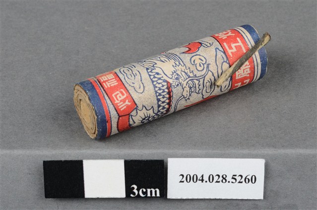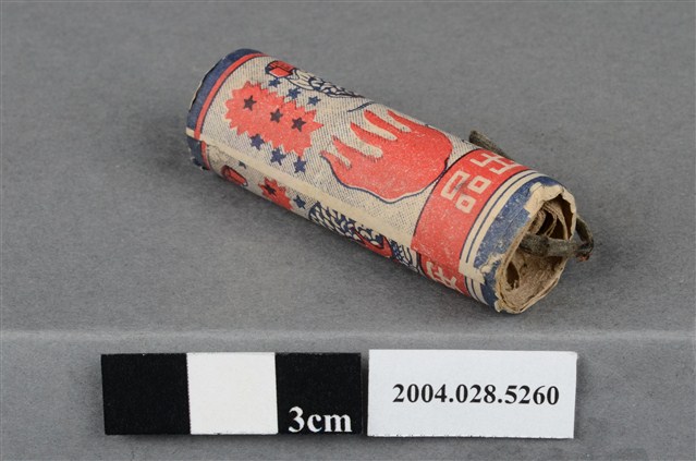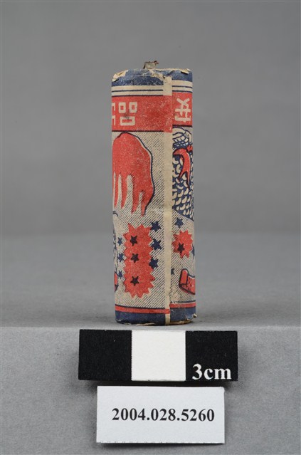 1. 本件為永安花炮工廠出品之萬福炮,炮身呈圓柱狀,外層包裝印有紅、藍雙色印刷之祥龍之圖案式,以及「萬福炮」、「永安花炮工廠」等字樣。本件屬單炮,以紙卷包裹微量火藥,內藏引線突出於頂端,頂端露出一小段引信及些許黑色火藥。