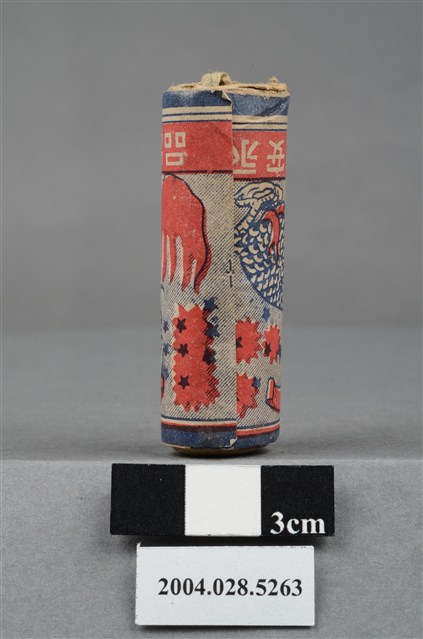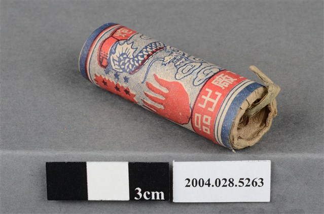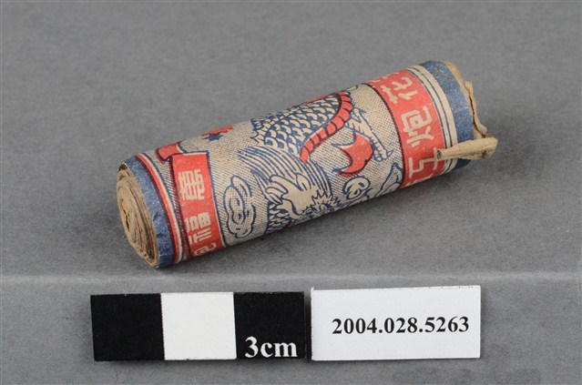1. 本件為永安花炮工廠出品之萬福炮,炮身呈圓柱狀,外層包裝印有紅、藍雙色印刷之祥龍之圖案式,以及「萬福炮」、「永安花炮工廠」等字樣。本件屬單炮,以紙卷包裹微量火藥,內藏引線突出於頂端,頂端露出一小段引信及些許黑色火藥。