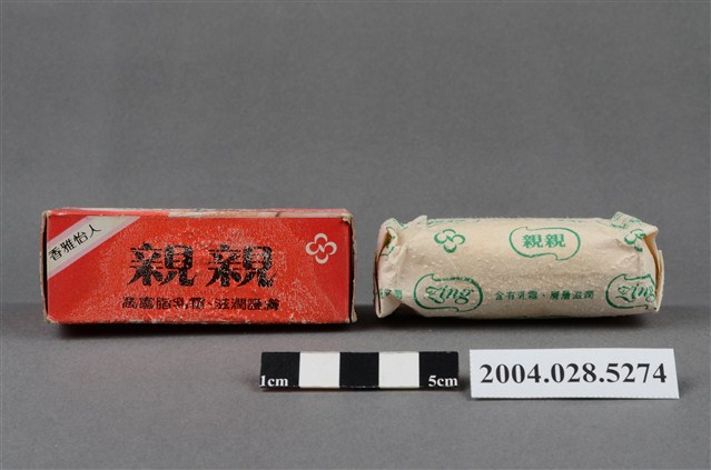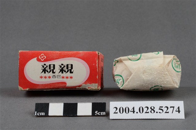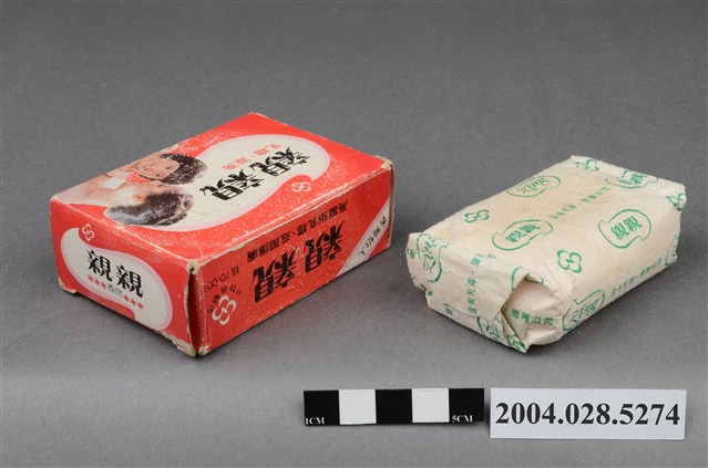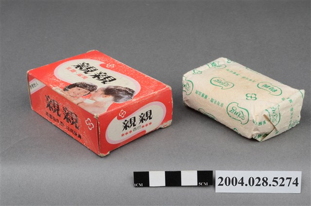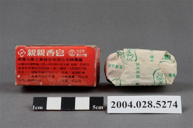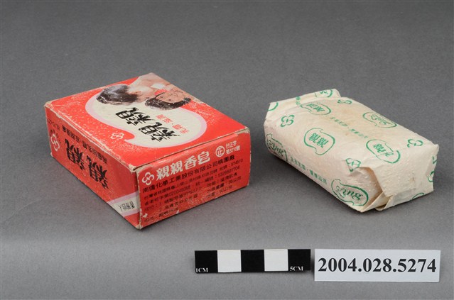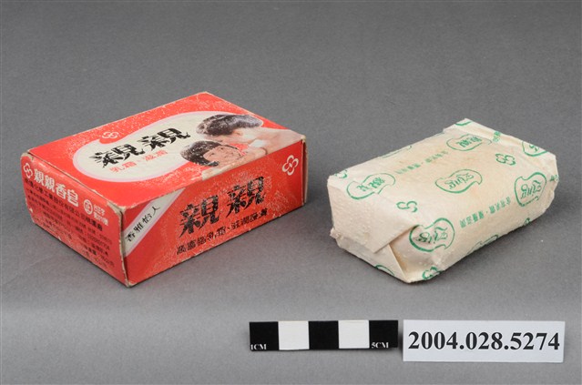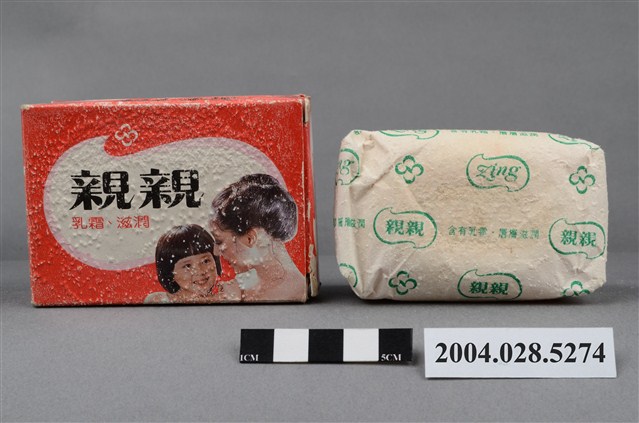 本文物為南僑化學工業股份有限公司桃園廠製親親香皂,有外包裝紙盒及內容物兩樣,分別敘述:外包裝紙盒以紅色調為主,正反寬面印有「親親」跟「乳霜、滋潤」字樣,還有母親與小孩的圖片。一側開闔處印有製造工廠名稱和地址、成分、用法、效能等商品資訊;內容物香皂以一層印有「含有乳霜,層層滋潤」標語的包裝紙包裹。南僑化學工業股份有限公司成立於1952年,親親香皂是南僑於1970年推出的商品,並於1992年1月8日獲得日用香皂正字標記字號台正字第5681號,品質獲得肯定。