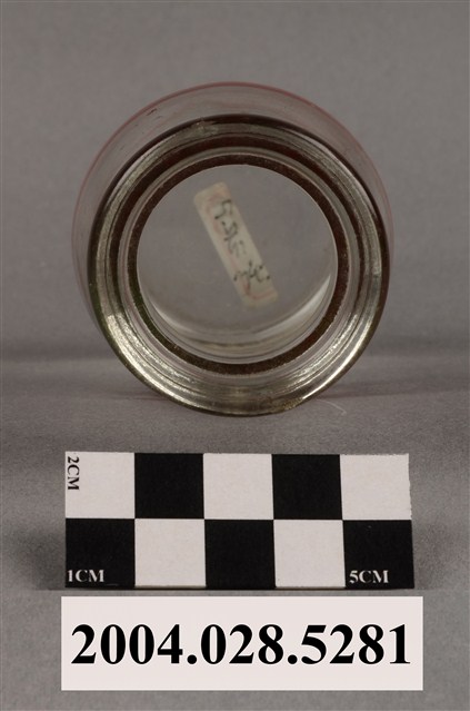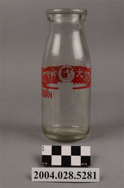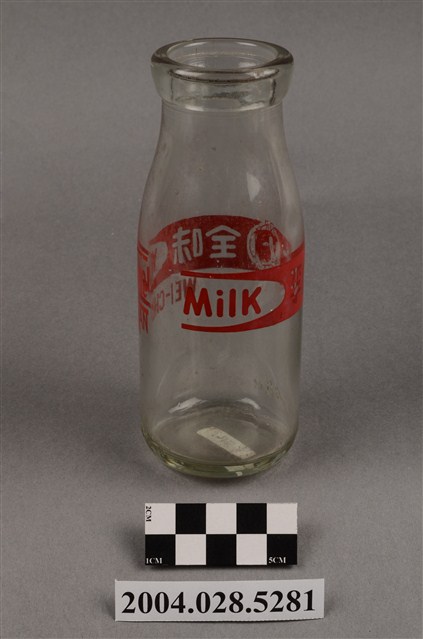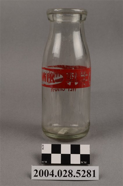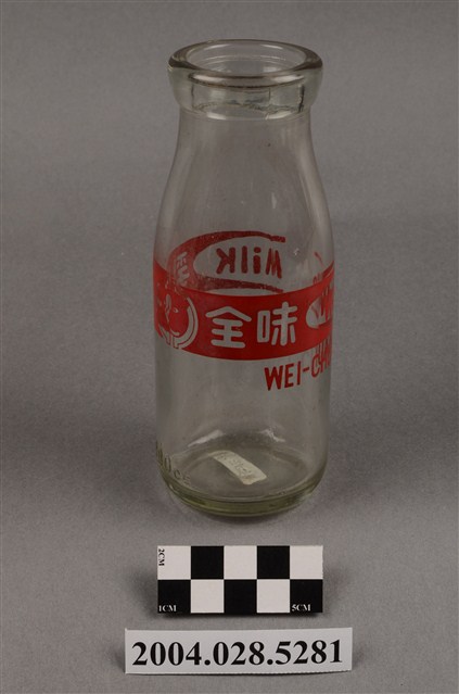 1.此件玻璃牛奶瓶由透明玻璃製成,長約5.6公分,寬約5.6公分,高約14公分。瓶口寬廣微成倒梯形,溜肩,連至瓶身後成直筒狀到瓶底。瓶身印有一圈帶狀的紅色圖案與文字,正中央有一卡通牛頭圖案,右側印著「味全」,左側印著「牛乳」字樣,背面有「Whole Milk」字樣,側邊印著「WEI-CHUAN」字樣。瓶身正面靠近瓶底壓有「180cc」字樣,背面則壓有菱形小符號,兩側各有「83」與「8」的字樣。瓶底有白色紅框標籤貼,上面用黑筆寫著「4/3之RP」字樣。2.臺灣在早期民生用器具多由陶、瓷製成,直到日治時期受