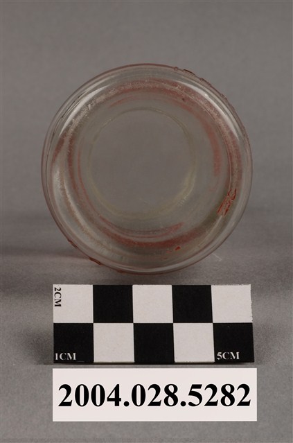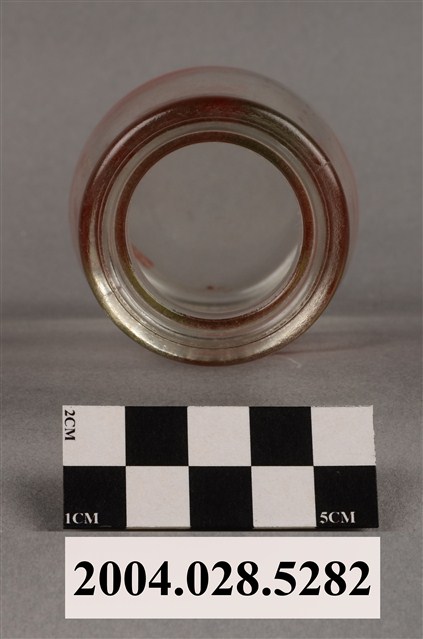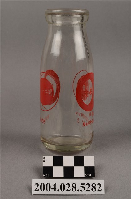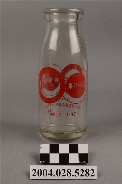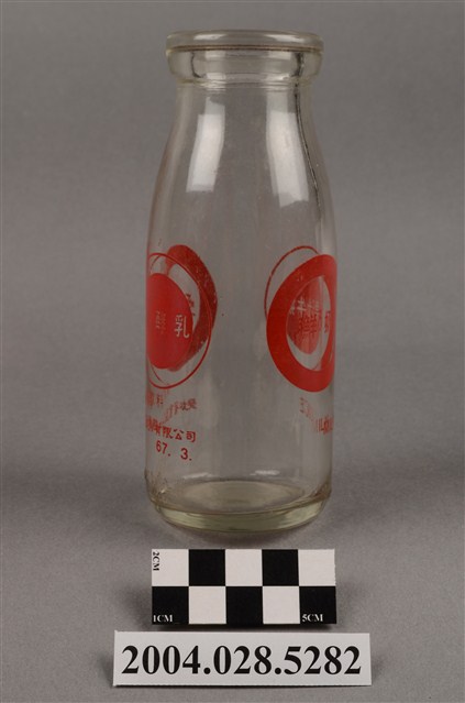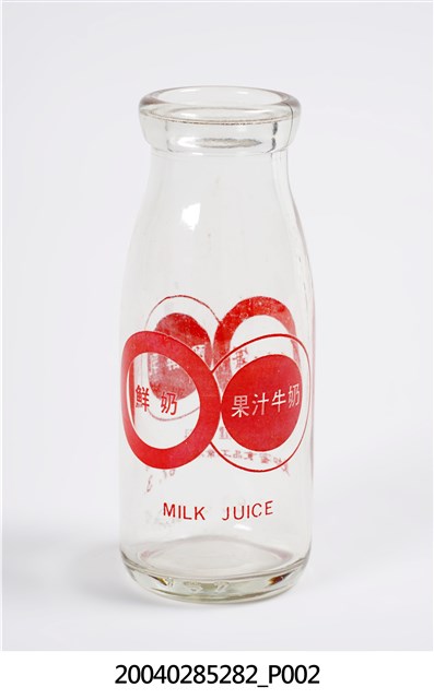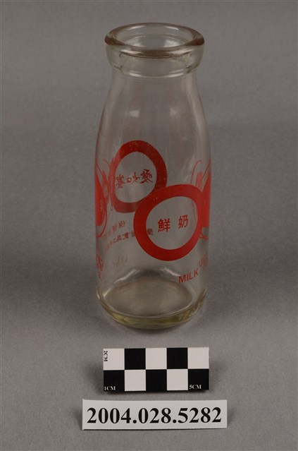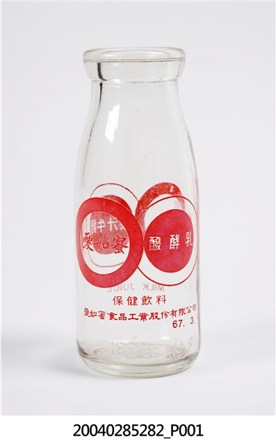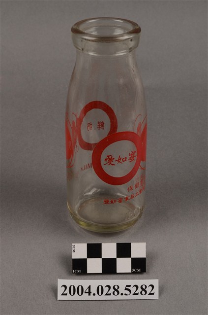 1.此件玻璃牛奶瓶由透明玻璃製成,長約5.6公分,寬約5.6公分,高約14公分。瓶口寬廣微成倒梯形,溜肩,瓶身直筒到瓶底。瓶身正面印有紅色圖樣與文字,由兩個圓圈交疊並排,圓圈內分別印著「愛如蜜」與「發酵乳」的字樣,圓圈下方印著「保健飲料」與「愛如蜜食品工業股份有限公司」兩行字,右下角印著「67.3.」,推測為生產年份與月份,靠瓶底位置壓有「180cc」字樣。瓶身背面與正面一樣由兩個圓圈交疊並排,圓圈內分別印著「鮮奶」與「果汁牛奶」的字樣,下方印著「MILK JUICE」,靠瓶底位置壓有菱形小標示,左右分別