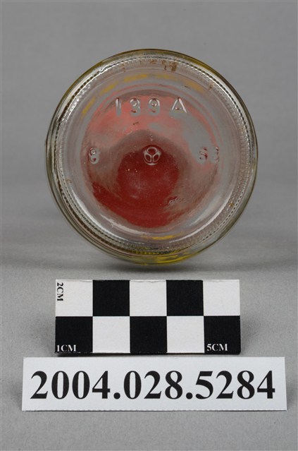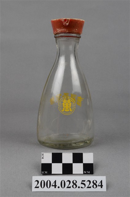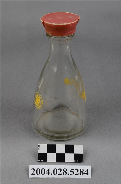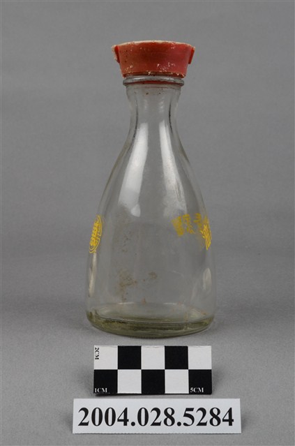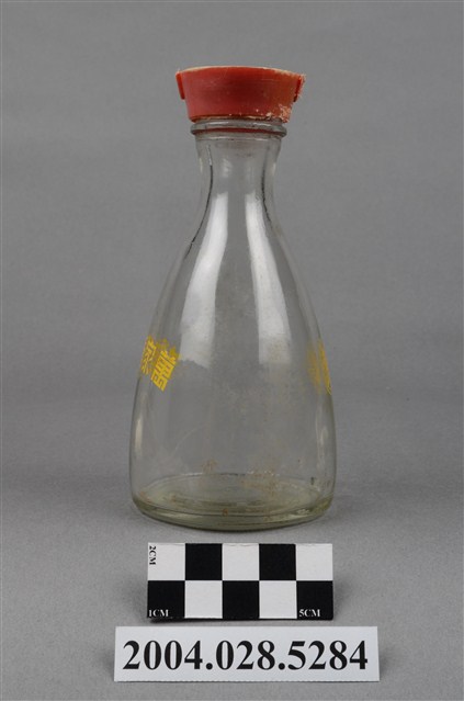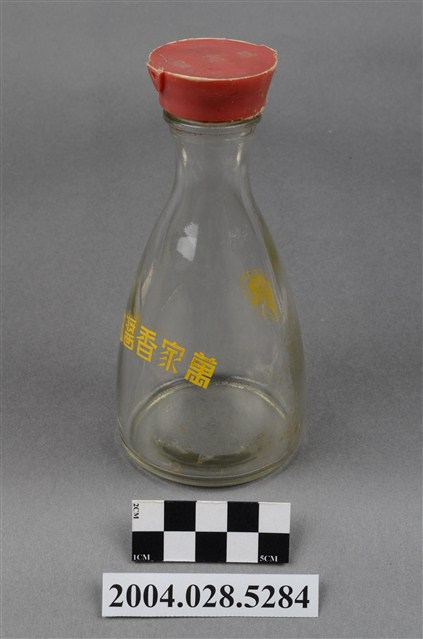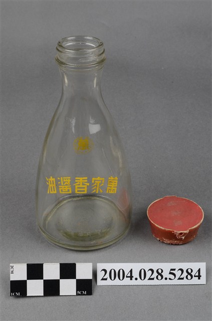 1.此件玻璃醬油罐由透明玻璃瓶身與紅色塑膠瓶蓋組成,長約6.5公分,寬約6.6公分,高約13.5公分。瓶蓋呈向下內縮圓柱狀,兩側有小孔作為醬油出水口。瓶蓋為旋蓋式固定於於玻璃瓶身上,蓋頂壓有「萬家香」三自,瓶口有螺旋壓紋,瓶頸內縮,以溜肩曲線連至瓶身與瓶底。瓶身正面印有黃色「萬家香醬油」字樣,背面印有萬字圖案。瓶底壓有「139A」與三等分圓形小標示,小標是左右各有「8」、「s3」字樣。2.臺灣在早期民生用器具多由陶、瓷製成,直到日治時期受總督府西化、現代化的影響下,引進與開發玻璃產業,玻璃製的日常用品才