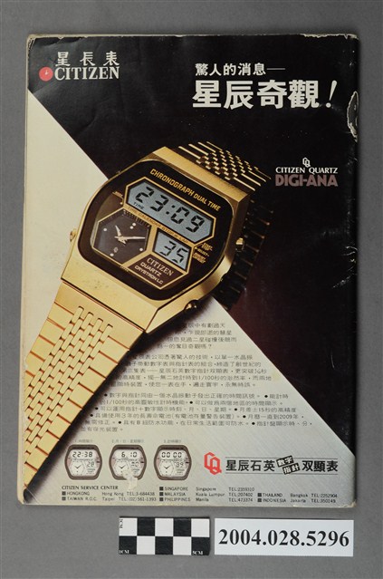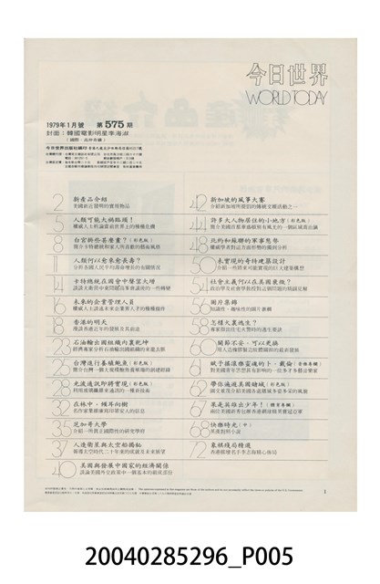1.本物件為今日世界雜誌第575期,紙質文物。該雜誌封面主角為韓國電影明星「李海淑」,物件正面上方可見「今日世界」字樣,右下方可見「一月號 第575期」字樣。物品背面為星辰表廣告。物件內頁可見「1979年1月號 第575期」、「封面 韓國電影明星李海淑」、「今日世界出版社編印」字樣以及雜誌目錄,目錄可見「新產品介紹」、「人類可能大禍臨頭」…等標題。