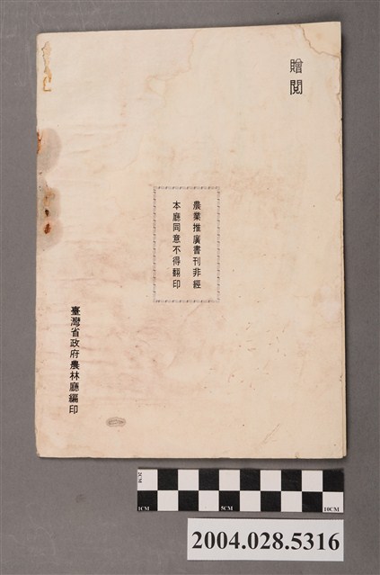 1.本物件為《鼠害防治》,由臺灣省政府農林廳編印。封面印有鼠害防治四字,亦有兩圖,一圖是數隻老鼠吃了老鼠藥倒在地上,另一圖為房子和樹。背面有贈閱、農業推廣書刊非經本廳同意不得翻印和臺灣省政府農林廳編印等字樣。目次內容分成兩大部分,一是野鼠:野鼠種類和生態與怎樣防治野鼠,二是家鼠:鼠害與公共衛生、家鼠種類和生態、家鼠防治之基本原理、怎樣防治家鼠和社區之家鼠防治。