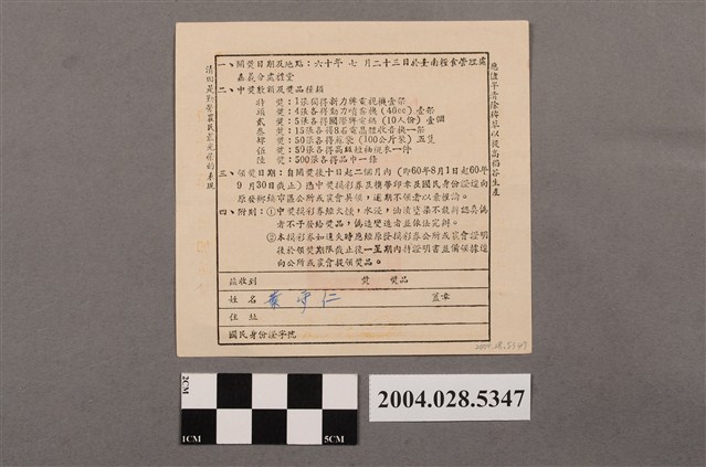 臺南糧區民國60年第一期稻作清田競賽摸彩券
