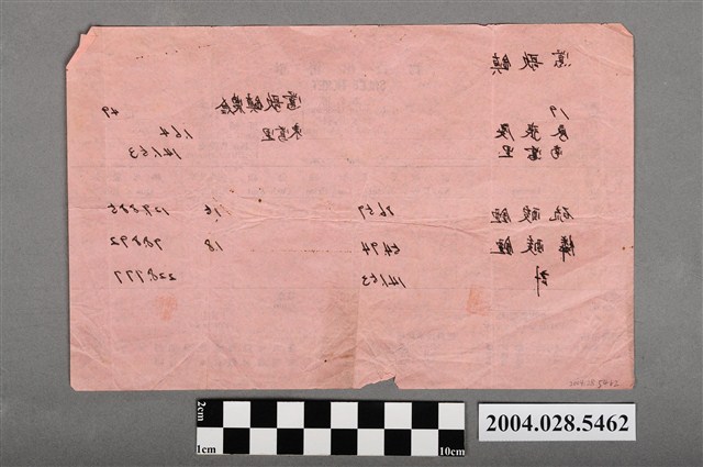 本物件為鶯歌鎮物資出售單,出售地點為鶯歌鎮農會。根據該出售單可看出,農人可以用現金或是用米換取硫酸錏、磷酸錏或硝酸錏等肥料,肥料換米的比率註記於單據下方。從單據中可見廖張慶換了硫酸錏86.57公斤,磷酸雅54.94公斤。