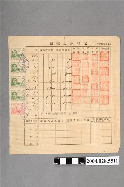 本物件為臺北市第六信用合作社社股票,為紙質,正面記載內容包括認購股者為林佛樹,購買臺北市第六信用合作社股票,購買日期為民國37年(1948)9月11日,購買55股,共新臺幣110元,物件核蓋完成日為民國41年(1952)10月10日;背面為續繳股款登記表,共有「日期」、「續繳股款數」、「連期累計數」、「會計蓋章」、「司庫蓋章」、「經理蓋章」及「理事主席蓋章」7格,前7行已進行填寫登記。下方為轉讓登記表格,包含「轉讓年月日」、「轉讓人簽名蓋章」、「受讓人簽名蓋章」、「本社承認蓋章」等,皆未填寫。左側貼有4張1角、1張5分的印花稅票,皆有蓋上藍色印花戳記。