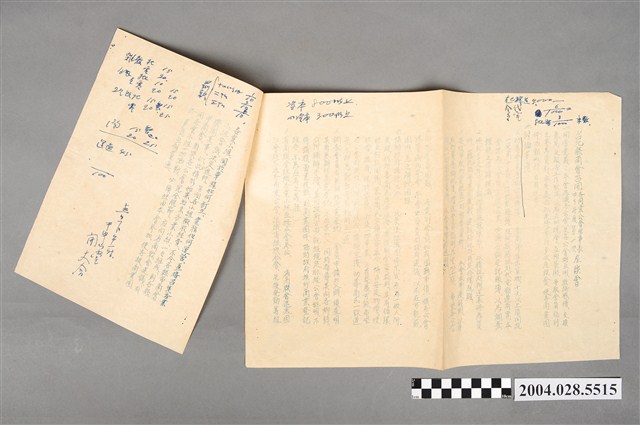 1.本物件為臺北縣商會召開各同業公會理事長40年度第1次座談會討論事項,為紙質,長方形形式,由1大1小共2張紙黏貼而成。右側有「臺北縣商會召開各同業公會理事長40年度第1次座談會討論事項」藍色字樣,左側內容包含「開會意義」、「討論事項」,邊緣空白處及文中皆有藍筆註記、劃記痕跡,物件有泛黃痕跡。