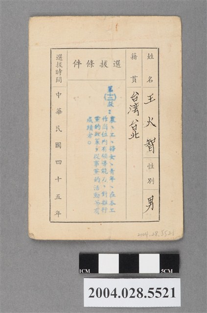 此為「中國國民黨四十四年度優秀黨員選拔證」,正面蓋有單位印鑑,背面為候選者資料表格,選拔時間於1956年。 中國國民黨在臺灣之統治,始於二戰後的接收時期。1945年日本於太平洋戰爭中戰敗投降,中華民國政府設置臺灣省行政長官公署負責臺灣的接收事務,並透過「三民主義青年團」、「國民黨臺灣省執行委員會」、「國民黨臺灣省黨部」等機構穩固社會各方面的統治基礎。1950年代,中國國民黨施行了連串的黨務改造,透過黨員大會、各級黨員代表大會,以及黨內各級委員會之層層建置,在臺灣地方自治之背景下發展黨的基層結構,使其動員機制深入地方社會,形成黨國體制。 1949年,內戰失利的中國國民黨黨中央及中華民國中央政府正式遷移臺灣,並於國內實施戒嚴及動員戡亂體制,形成長期的一黨專政。1987年解嚴後,中華民國政府透過憲政改革推行中央民意代表與總統、副總統之改選、普選,進而於1996年實施了首次的總統、副總統直選,後又於2000年的總統大選中完成政黨輪替,結束了中國國民黨在臺灣社會長達半世紀的執政。