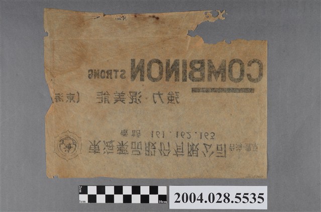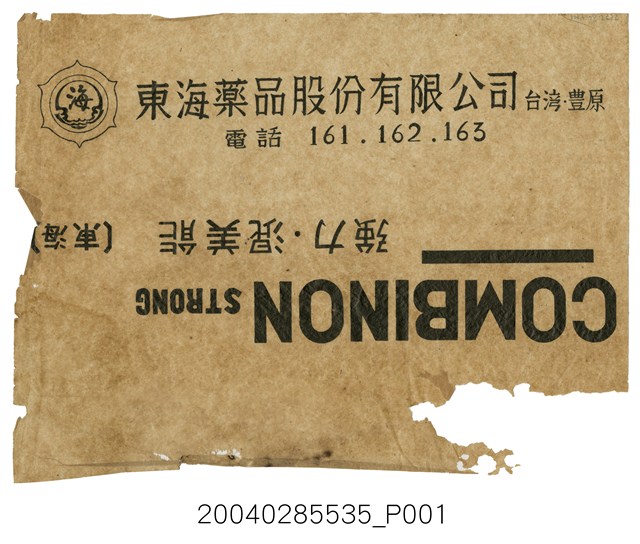 本物件為臺灣豐原東海藥品公司商標紙。商標紙為單張紙單面有字,印有COMBINON STONG、強力、混美能、東海、東海藥品股份有限公司、臺灣豐原等字樣。