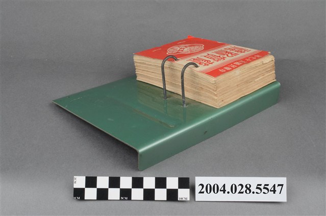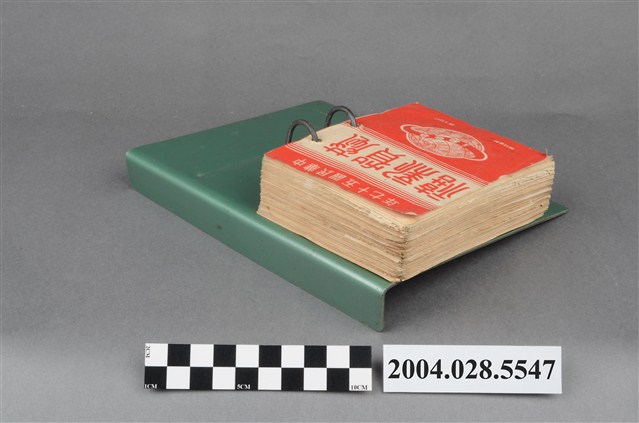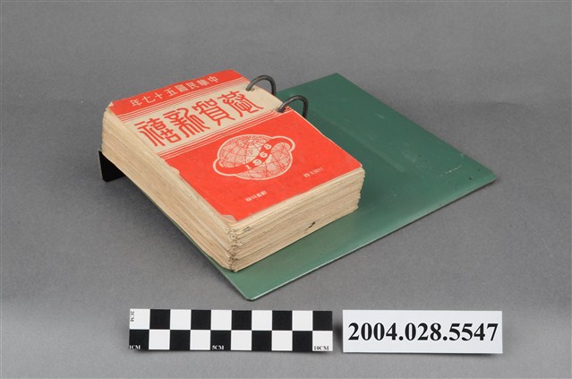 本物件為恭賀新喜年曆本,由明正文具印刷行製作。年曆本封面為紅色,上半部為「中華民國五十七年」、「恭賀新喜」,下半部為地球圖案,地球上有一環帶寫有「1968」,地球圖案下方有「打回大陸」、「解救同胞」之字樣。年曆本以鐵環固定在板子上。明正文具印刷行地點位於臺中市光復路六十之四號,合作大樓內。