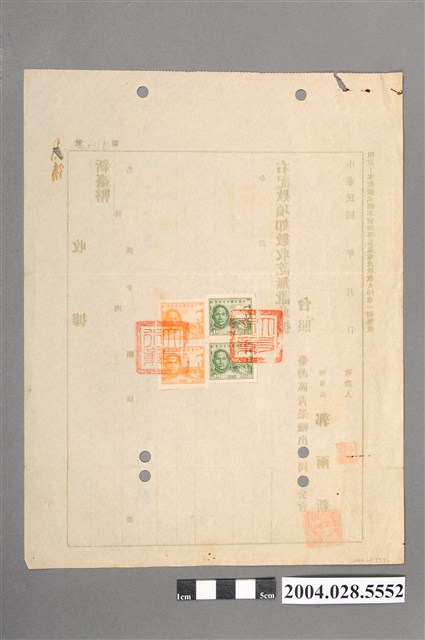 1.本物件為收據,為紙質。長方形形式,紙張上方打有2孔可用於裝訂,表單內容包含賈納金額為新臺幣300元,項目為民國44年(1955)的下半年會費,繳納人為大友行,對象為臺灣區青果輸出業同業公會,日期為民國44年11月4日。左下角蓋有公會及收款人印鑑。表單背面貼有2張1角、2張5角的印花稅票,並蓋有大友行的章。物件有泛黃、破損。