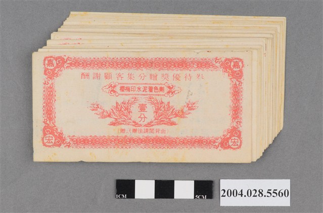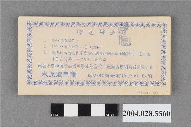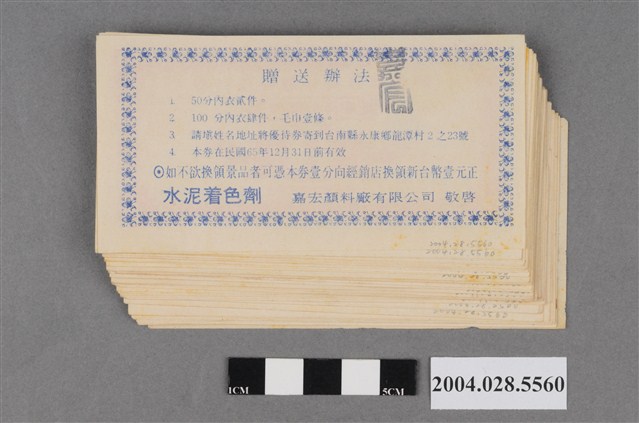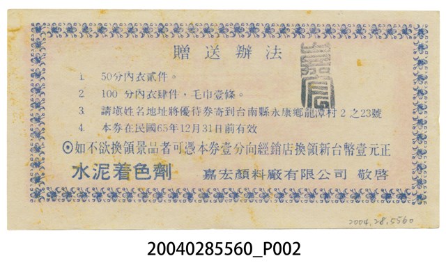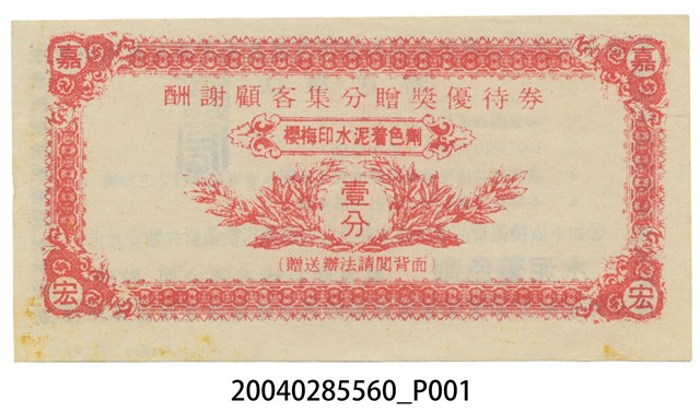 本物件為嘉宏顏料水泥著色劑集分優待券,為紙質,長方形形式,優待券上有「嘉宏顏料水泥著色劑集分優待券」字樣,中央有「壹分」字樣,邊框有花紋,正面整體皆為紅色印刷,背面內容為贈送辦法,蓋有「嘉宏」印章。有效期限為民國65年(1976)12月31日,邊框有花紋,背面整體皆為藍色印刷,物件有泛黃痕跡。