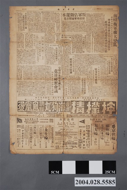 此為一紙質報紙,為1948年(民國37年)10月22日發行《中華日報》的第3、4版報紙,內容計有:〈南韓叛軍擴大變亂 傳韓共推動叛亂計劃推翻韓國政府 李承晚即將宣布全國戒嚴令 駐韓美軍必要時將採取行動〉、〈叛軍佔領麗水 韓政府軍馳援戡亂〉、〈南美各國支持南韓〉、〈曼谷暴風雨(上) 逞羅大逮捕案真相〉、〈吉田茂主張 佔領軍繼續駐日他承認難控制立法機構〉、〈王正廷在菲表示戰爭不可避免 渠對政府戡亂抱必勝信心〉、〈不列顛自治領會議 秘密商討防務〉、〈日本無條件投降前 美僅有原子彈數枚〉、〈安理會各理事國代表竟日秘密會議 研究所折衷解決柏林危機辦法〉、〈臺灣,琉球,日本通考之一 臺灣通考(一)〉(梁嘉彬)、〈臺灣漢民族的來源〉(嘉彬)等等,另刊有多篇廣告。 此物件所代表的《中華日報》,創辦於1946年2月20日,此報紙為國民政府接收臺灣時所創辦,並且由中國國民黨的中央宣傳部指派特派員盧冠群籌備《中華日報》。在接收初期,行政長官公署將《臺灣民報》接收改為《臺灣新生報》,並令青年黨人李萬居作為社長,對此中宣部感到不滿,認為臺灣應該設立國民黨的黨報以作為黨的喉舌,於是提出應將《臺灣民報》中的印刷機器的一半交給《中華日報》,長官公署則提出需將《中華日報》設址臺南以免兩報衝突,最後雙方勉強接收打開僵局。 最終《中華日報》設址於臺南車站前的《臺灣日報》社社址,同時也是勤業銀行臺南支店的所在地,後此建築在1981年遭到拆除。《中華日報》後逐漸轉為臺南的地方性報紙,而在2005年因立法院通過「黨政軍退出媒體」的決議,於是國民黨開始試圖脫手「五中」──即為中影、中廣、中視、中華日報、中央日報,對此中國時報集團接手前三者,旦退回中華日報、中央日報,最終中央日報解散,而中華日報因有自立的財源,因而得以持續經營。