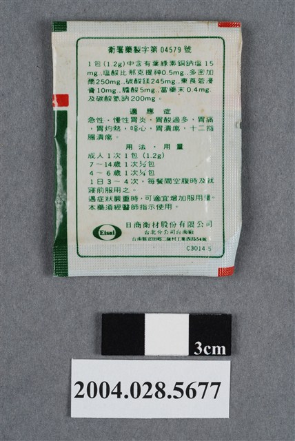 1. 本物件為爽胃王藥散之包裝。包裝封面以綠色為主調,印有綠色的胃藥、爽胃王顆粒和Saclon字樣。背面則有衛署藥製字第04579號、成分(葉綠素銅鈉塩等)、適應症(急性.慢性胃炎、胃酸過多等)、用法用量和藥廠資訊等內容。