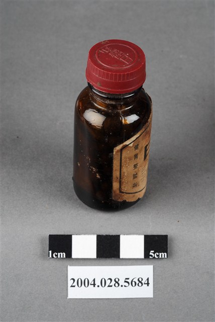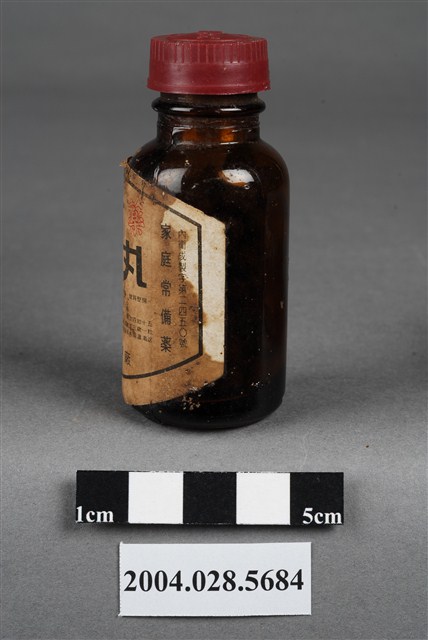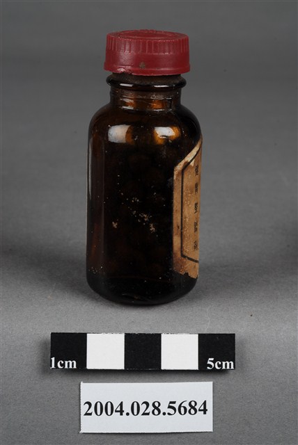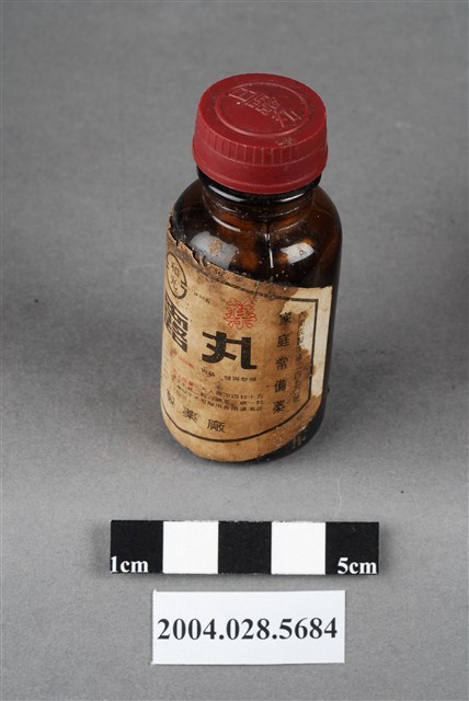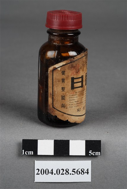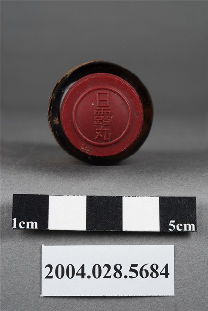 1. 本物件為和光製藥日露丸。瓶裝,瓶身為深茶色,似玻璃材質,瓶蓋為紅色,似塑膠材質。瓶身貼有標籤,印有註冊商標以及日露丸、成藥、主治效能(胃痛、健胃整腸等)、用法用量、和光製藥廠、家庭常備藥、內衛成製字第2450號、成分和健胃整腸劑等字樣。瓶蓋上有日露丸字樣。