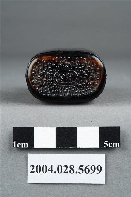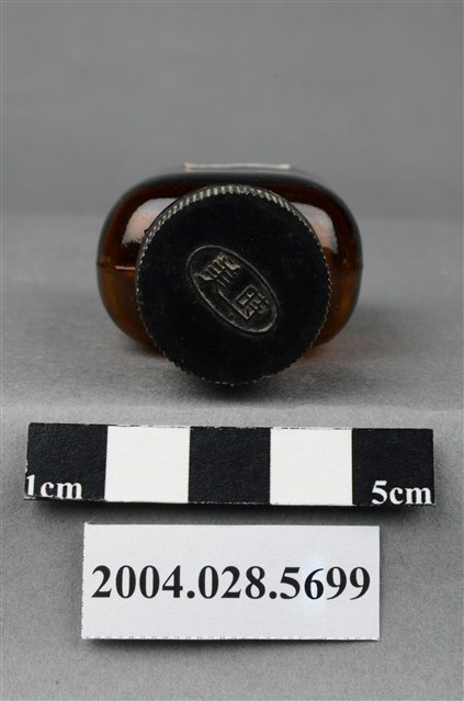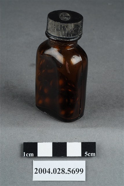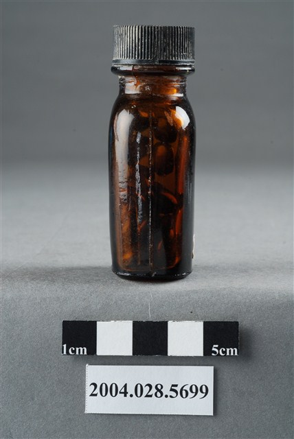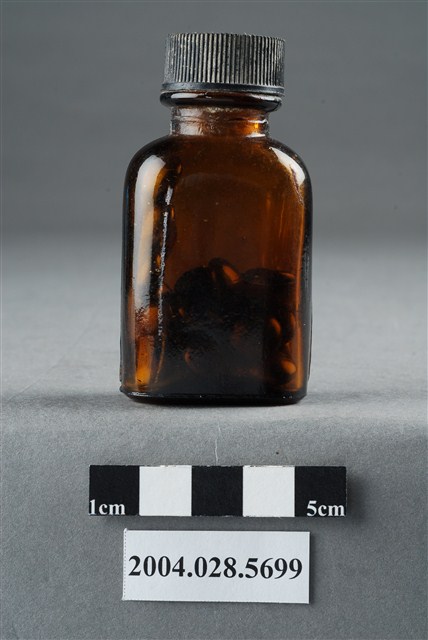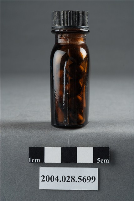 本物件為藥罐。罐身為深茶色,似玻璃材質,瓶袋為黑色,似塑膠材質,內裝黑色藥丸。