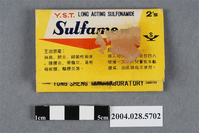 1. 本物件為永生堂長效消炎片之外包裝。外包裝為紙製品。封面為黃色,其上印有永生堂、美國藥典第十六版磺甲氧噠嗪錠、長效消炎片、2片、持續性長效磺胺劑和藥典登字第1331號,以及成分內容和兩人抱在一起的圖片。背面則印有主治效能(淋病、肺炎、細菌性痢疾、腹膜炎等)和用法用量等內容。