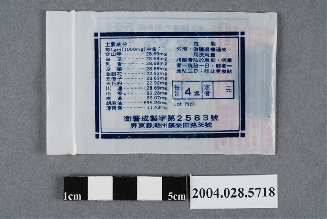 1.本物件為搥元膏。包裝為白色塑膠袋,封面印有成藥、消炎鎮痛外用良藥、搥元膏等字樣和製藥廠資訊,以及註冊商標。背面印有主要成分(穿山甲、白芷、乳香等)、效能(消腫退癢過皮)、數量(每包四塊)和衛署成製字第2583號。