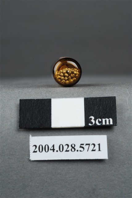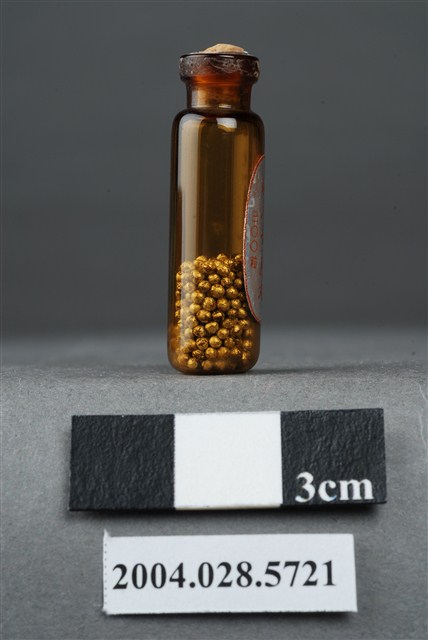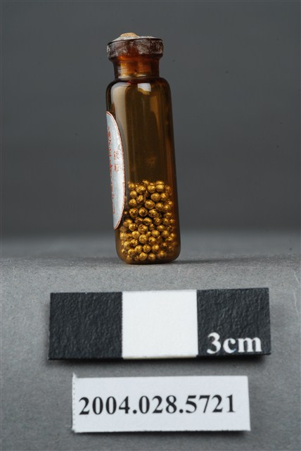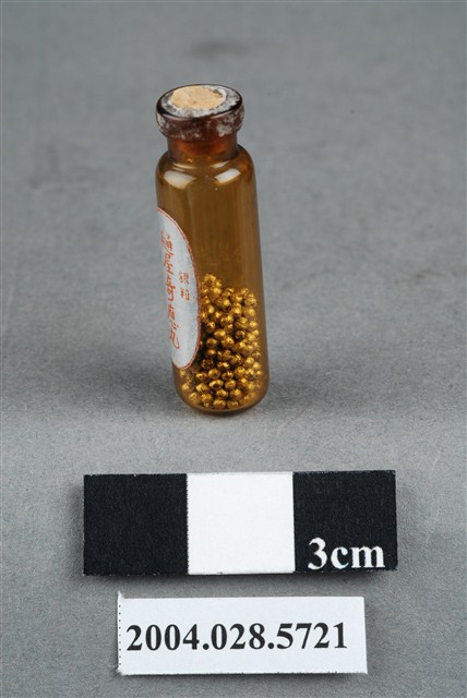 1.本物件為樋屋奇應丸。瓶裝,瓶身為透明茶色,瓶塞似木質材料。瓶身貼有標籤紙,印有樋屋奇應丸、銀粒和300粒字樣。瓶內有銀色小丸。