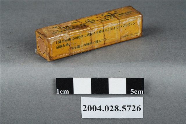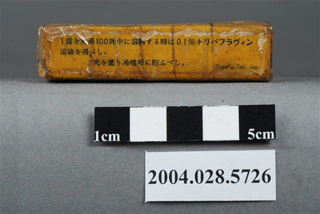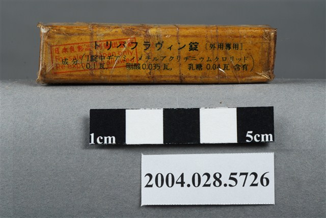 本物件為TRYPAFLAVIN。包裝為長條盒狀,土黃色,似紙類材質。包裝上印有英文藥品名和日文之成分、使用說明和製造商資訊等內容。