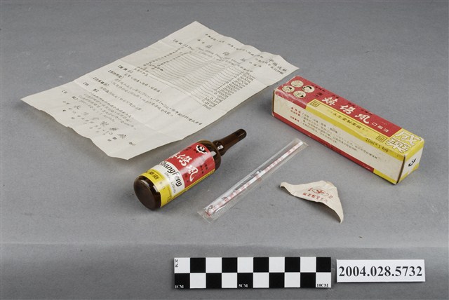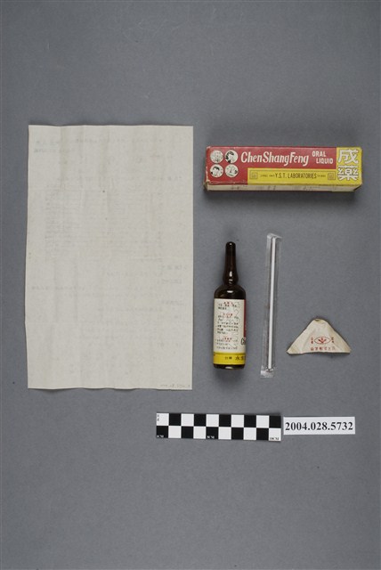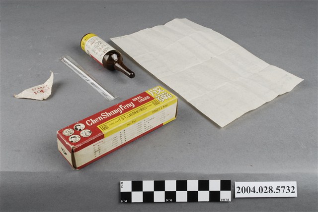 1. 本物件為鎮傷風口服液。共有4個物品,分別是外盒、藥瓶、口服用吸管和說明書。 2. 本產品標有內衛成製字第3124號,應為西元1949-1971年許可字號發證的產物,但在衛生福利部食品藥物管理署查無此藥資料。