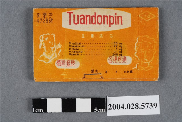 2. 本產品標有衛藥字4728號,應為二戰之後的產品,但在衛生福利部食品藥物管理署查無此藥資料。