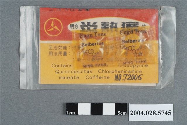 1. 本物件為炎熱痛。外包裝為塑膠袋,內有說明物件和藥片包裝。說明物件應為紙製品,封面印有明方、新消炎解熱止痛藥、炎熱痛片和炎熱痛,以及三張圖片,分別代表消炎、退熱和止痛。背面被藥片包裝遮住部分字樣,可見商標、明方炎熱痛片和衛字4773字樣,以及主治效能、用法用量和成分內容。內有2片藥片包裝,藥片被透明膠膜包住,其上印有Enga Tone和Belberine字樣。