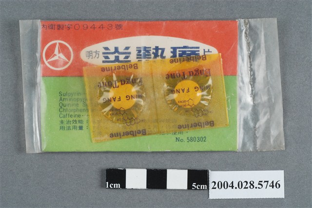 1. 本物件為炎熱痛。外包裝為塑膠袋,內有說明物件和藥片包裝。說明物件應為紙製品,封面印有明方、新消炎解熱止痛藥、炎熱痛片和炎熱痛,以及三張圖片,分別代表消炎、退熱和止痛。背面被藥片包裝遮住部分字樣,可見商標、明方炎熱痛片和衛字4773字樣,以及主治效能、用法用量和成分內容。內有2片藥片包裝,藥片被透明膠膜包住,其上印有Enga Tone和Belberine字樣。