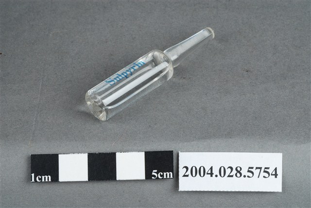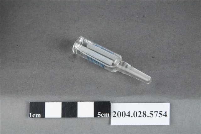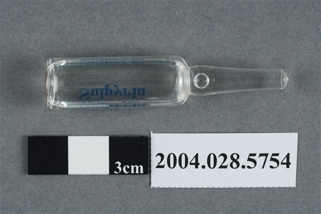 本物件為Sulpyrin注射液。容器為透明無色,分成兩部分,一部分為圓柱體瓶身,另一部分為較細長的管狀,頂端為圓弧型。圓柱體瓶身印有Sulpyrin藍色字樣,另有一些無法辨識的數字和英文字母。容器內有液體,為透明無色。