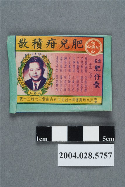 1.本物件為何濟公疳積散。外包裝封面正中央印有1塊板子,上有「何濟公疳積散」字樣,板子兩旁各有裸體幼兒成坐姿,單手扶著板子。另,從上至下的字樣分別有「兒科聖藥」、「去積除蟲」、「健脾開胃」和「內政化驗許可證台衛成字第17號」等。背面印有「肥兒疳積散」、「原名肥仔散」等字樣和主治效能內容,以及中年男子人頭照片像,下方標有「何濟公」字樣。背面底部另印有「香港深水埗海壇街」字樣,此藥品有可能是香港產品或香港發源。
