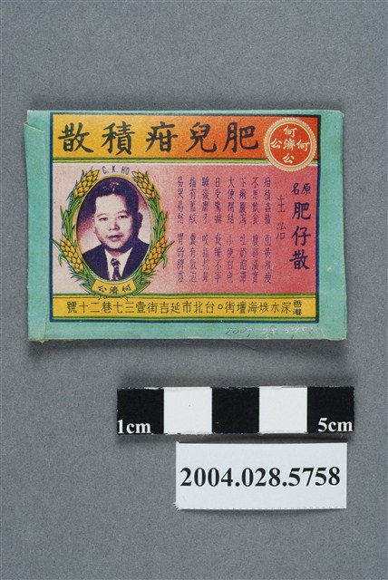 1.本物件為何濟公疳積散。外包裝封面正中央印有1塊板子,上有「何濟公疳積散」字樣,板子兩旁各有裸體幼兒成坐姿,單手扶著板子。另,從上至下的字樣分別有「兒科聖藥」、「去積除蟲」、「健脾開胃」和「內政化驗許可證台衛成字第17號」等。背面印有「肥兒疳積散」、「原名肥仔散」等字樣和主治效能內容,以及中年男子人頭照片像,下方標有「何濟公」字樣。背面底部另印有「香港深水埗海壇街」字樣,此藥品有可能是香港產品或香港發源。