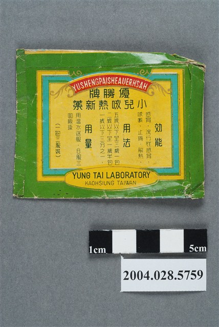 1.本物件為永泰製藥廠出品優勝牌小兒散。外包裝封面正中央印有1座獎盃,上有「小兒散」字樣,獎盃兩旁各有裸體幼兒成跪坐姿,雙手扶著獎盃。另,從上至下的字樣分別有「優勝牌」、「小兒散」、「臺灣省衛字第肆零柒捌號」和「註冊商標第叁零陸肆號」等。背面印有「小兒咳熱新藥」字樣和效能、用法用量內容。本藥品可治療感冒、咳嗽、止痛等。